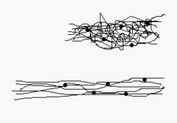 Élasticité entropique - La contrainte tend à ordonner les segments de chaînes du matériau, cette modification s'accompagne d'une diminution de l'entropie du système ; la suppression de la contrainte ramène le matériau à son état de désordre initial (état le plus probable correspondant à l'entropie la plus élevée du système). Les élastomères, pour lesquels l'état d'équilibre correspond à leur entropie maximale, sont des solides à élasticité entropique ; leur capacité de déformation élastique est importante