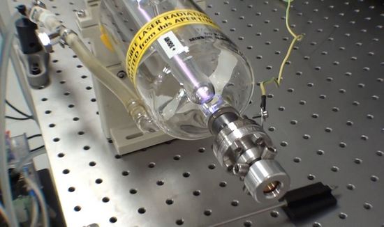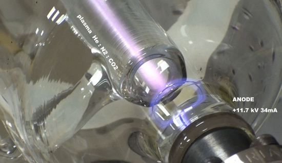 Ce tube je l'ai acheté il y a plus de 17 ans et aujourd'hui je l'ai mis en fonction pour la première fois et la puissance de sortie était de 27.5W. Il y a eu une légère indroduction d'air dans le tube ce qui donne au plasma une couleur bleutée.