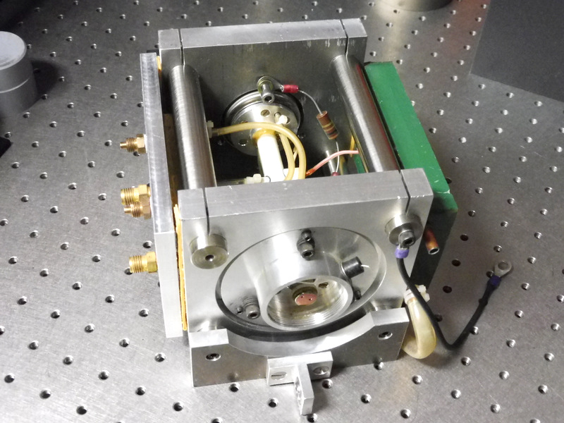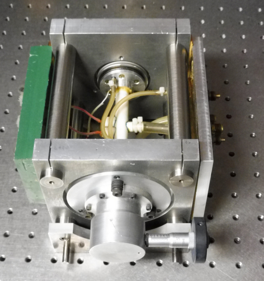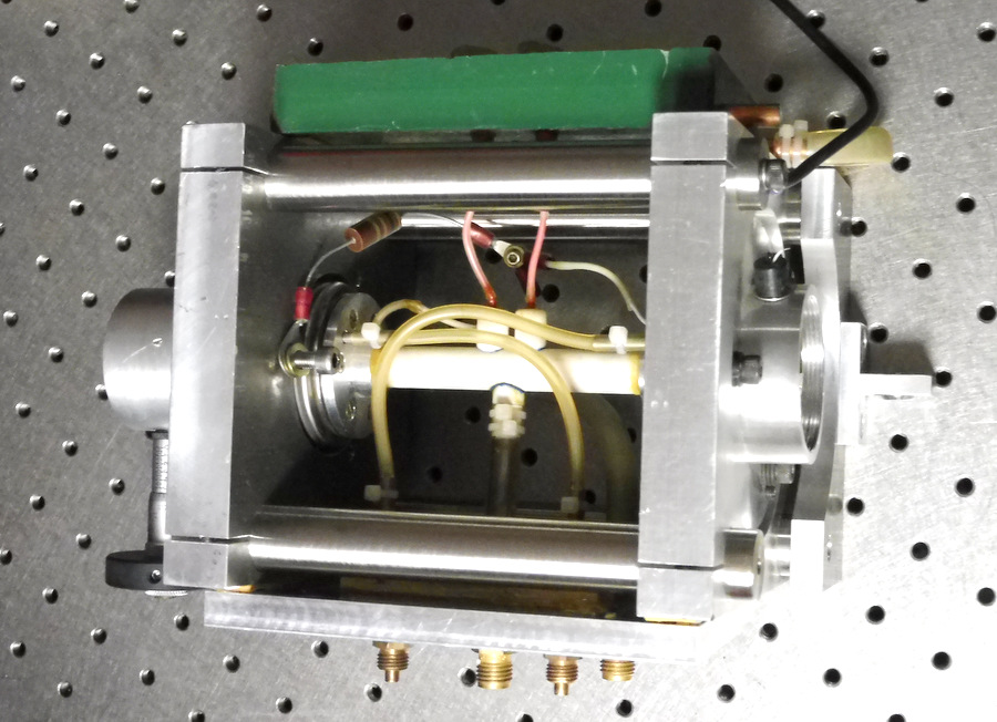 Petit laser CO2 accordable travaillant en régime d'oscillateur. Il se compose d'un tube de décharge capillaire en alumine équipé sous le tube d'un bloc en laiton dans lequel circule de l'eau de refroidissement. L'arrivée HT se fait par 2 électrodes montées au milieu du tube à décharge. Le résonateur se compose d'un réseau de diffraction monté dans l'enceinte contenant le gaz actif qui est un mélange (He:N2:CO2) ce qui évite d'avoir une fenêtre à l'incidence de Brewster. La sortie se fait par un miroir semi-transparent en germanium. Le tube capillaire en alumine à un lumen de 1mm et une longueur active de 100mm.