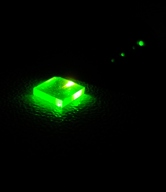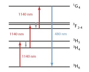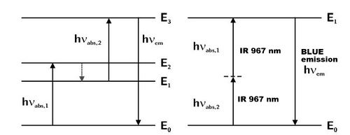 A counter-intuitive anti-stokes process occurs where the material absorbs lower