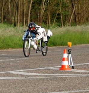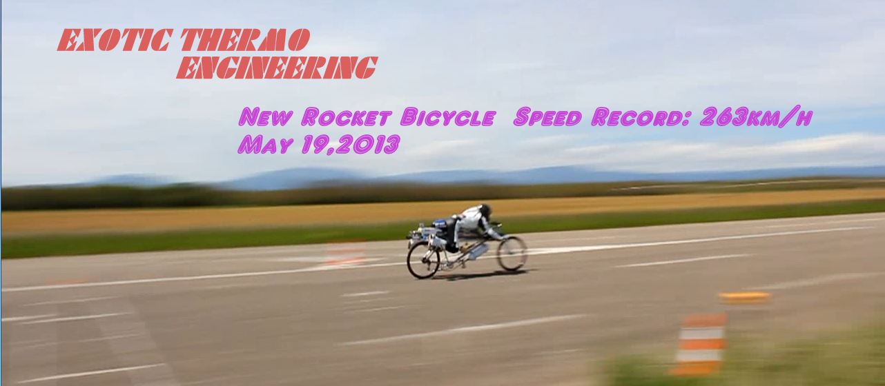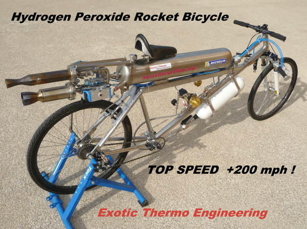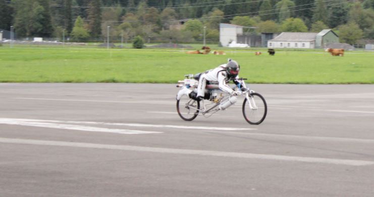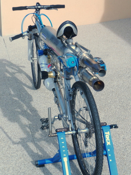 Réservoir rempli au maximum (12,5 litres de H2O2 à 86%), pression ajustée, concentration au maximum, puis mise en marche de propulseur. La montée en vitesse est rapide, les aspérités de la piste produisant de très fortes vibrations et chocs inconfortables, la force de vent se faisant de plus en plus intense…. Le vélo se déporte sur la gauche mais le pilote ne coupe pas les gaz, mais peu de temps après le vent relatif devient si puissant que sa tête est tirée en arrière avec une force telle que seul le contact du casque sur le bossage aérodynamique de la combinaison parviendra à limiter l’hyperextension.Heureusement, le réservoir est totalement vidangé très peu de temps après, et bien que cette brève mésaventure ait paru durer bien longtemps pour le pilote, il n’a toutefois pas interrompu la poussée…