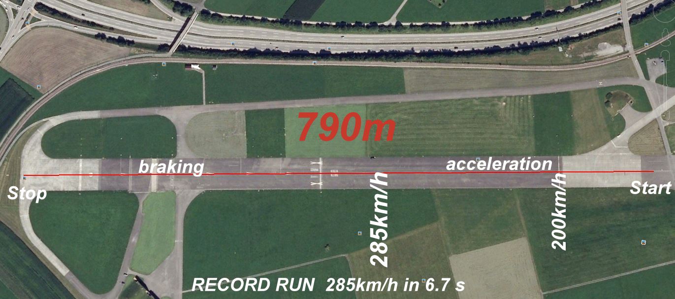 Durée de propulsion : 6,7 secondes Quart de mile départ-arrêté (402,33m) : 7,3 secondes Longueur de la piste : 790 mètres Poussée du moteur-fusée durant le run : 3.04 kN / 310 kgf / 683.4 lbf Soit une puissance de 240,75 kW (327 chevaux) produite à la vitesse de 285 km/h. Ingénieur : Arnold Neracher Pilote : François Gissy