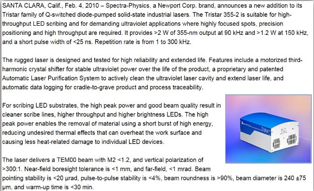 Qualité de faisceau (M²) : ~1.2 (valeur mesurée pour Tristar 355-3 dans l’étude d’application — excellente qualité, proche TEM₀₀). spectra-physics.cn