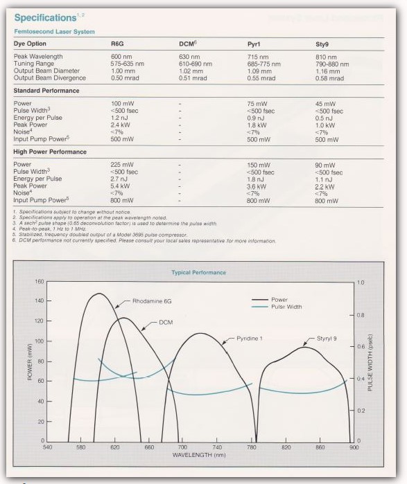 Spécifications constructeur : durée d’impulsion nominale, énergie/pulse, taux de répétition, tuneabilité, stabilité en puissance, refroidissement, taux de circulation du colorant et recommandations chimiques (solvant, conc.).