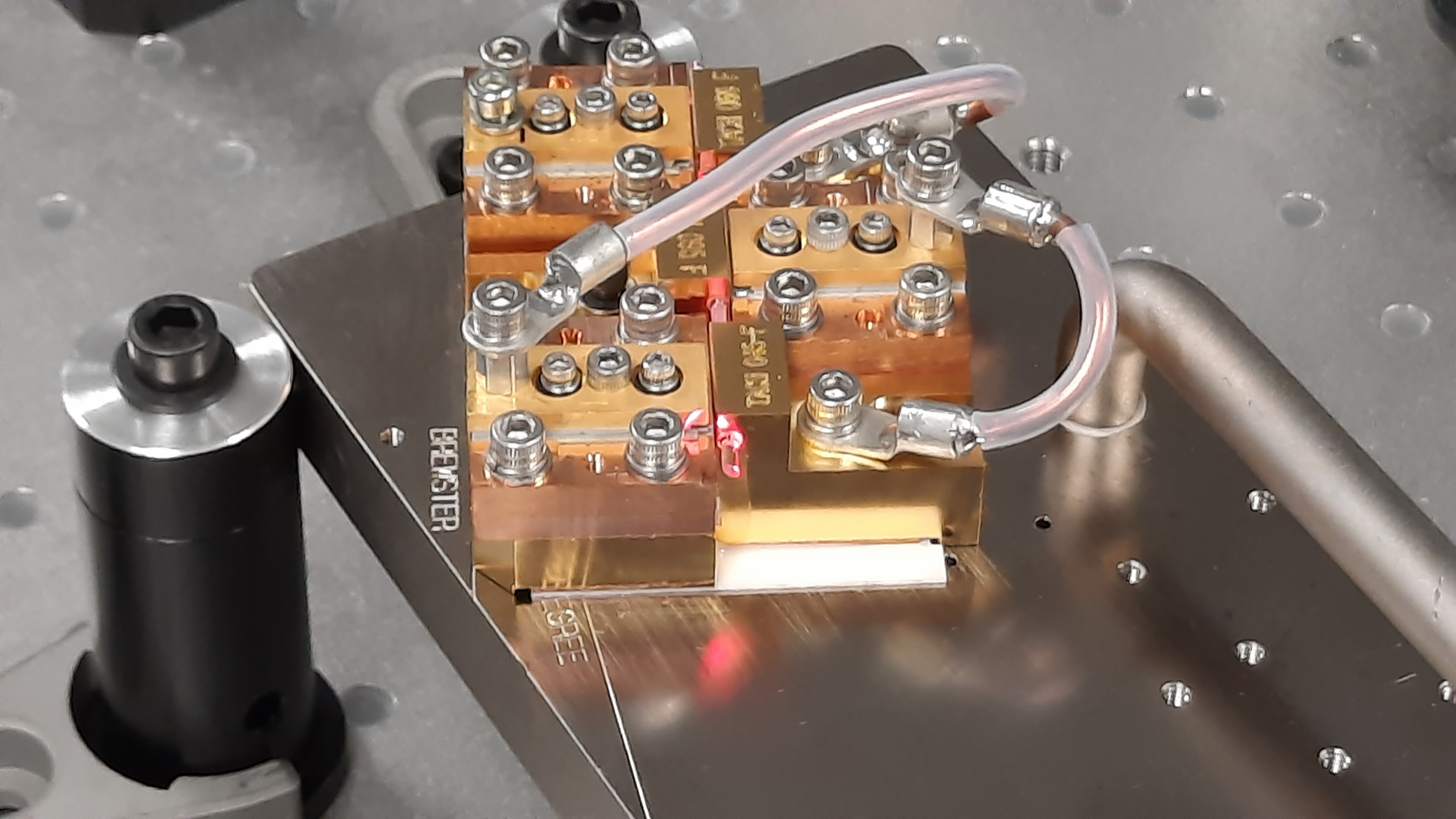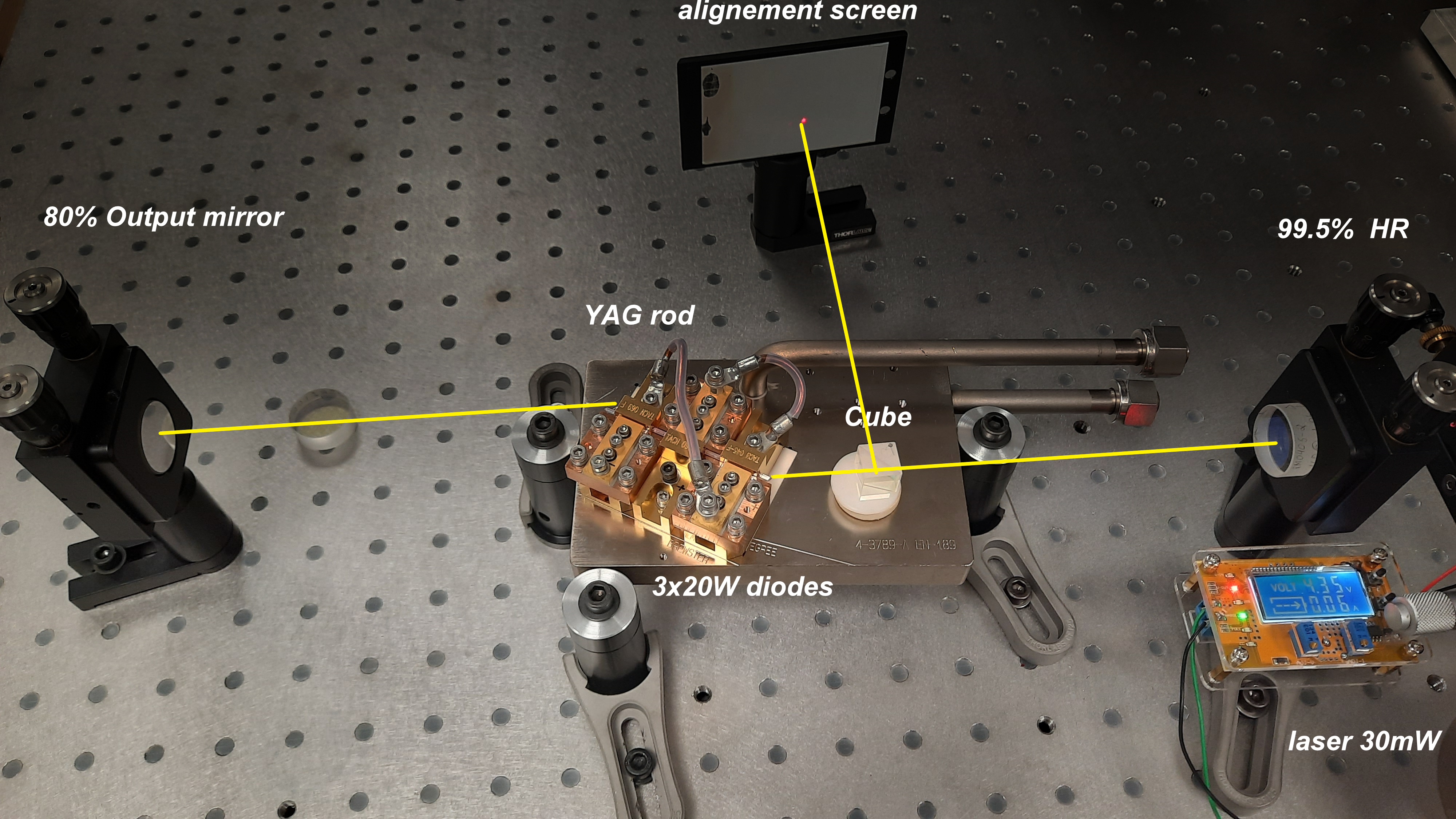 Le cristal YAG à un diamètre de 1.6mm x 70mm de long. Il est dopé avec 0.6% de Nd 3+. Les faces sont taillées à l’incidence de Brewster donc le faisceau laser est polarisé horizontalement.