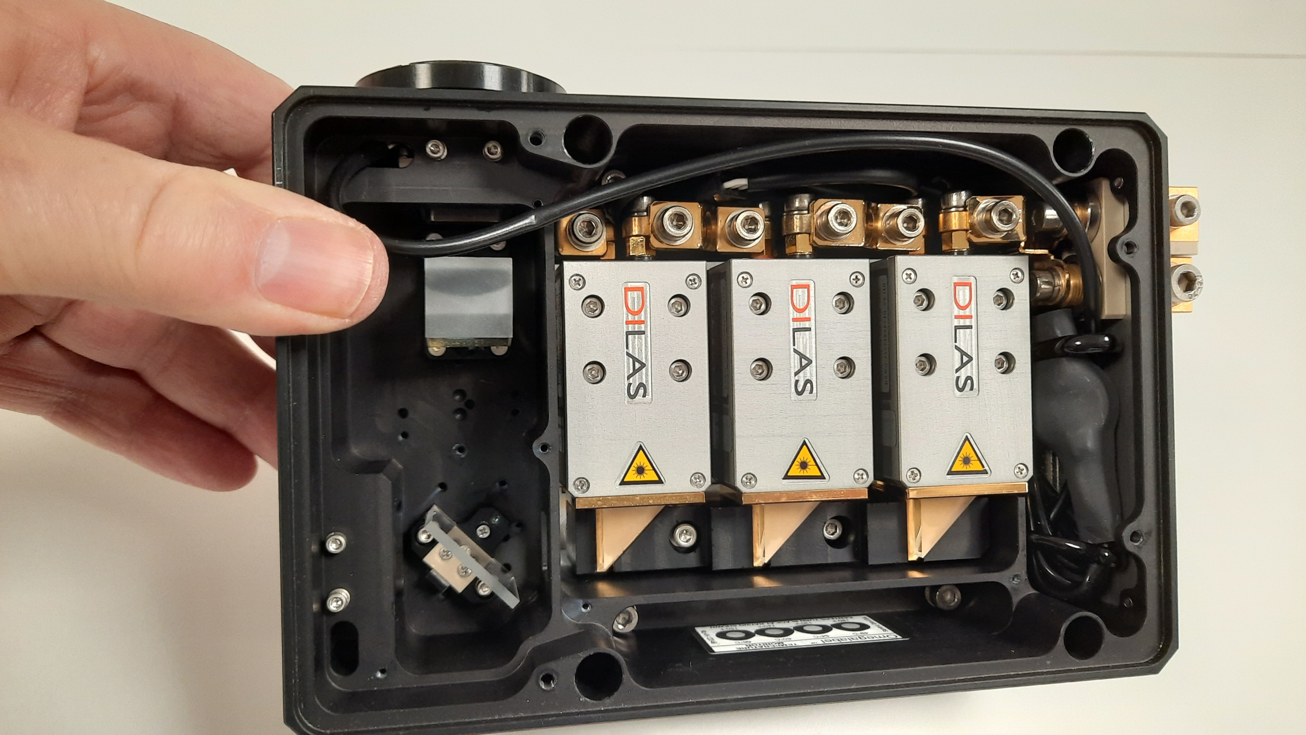 Elle se compose de 3 diodes de 33W cw dont la sortie passe à travers un prisme , chaque diode est décalée en hauteur de façon que les 3 faisceau ne se superposent pas. Ces 3 faisceaux sont focalisés sur la face d’entrée de la fibre optique de 400 microns par 2 lentilles plan cylindrique opposées de 90 degrés (x;y)