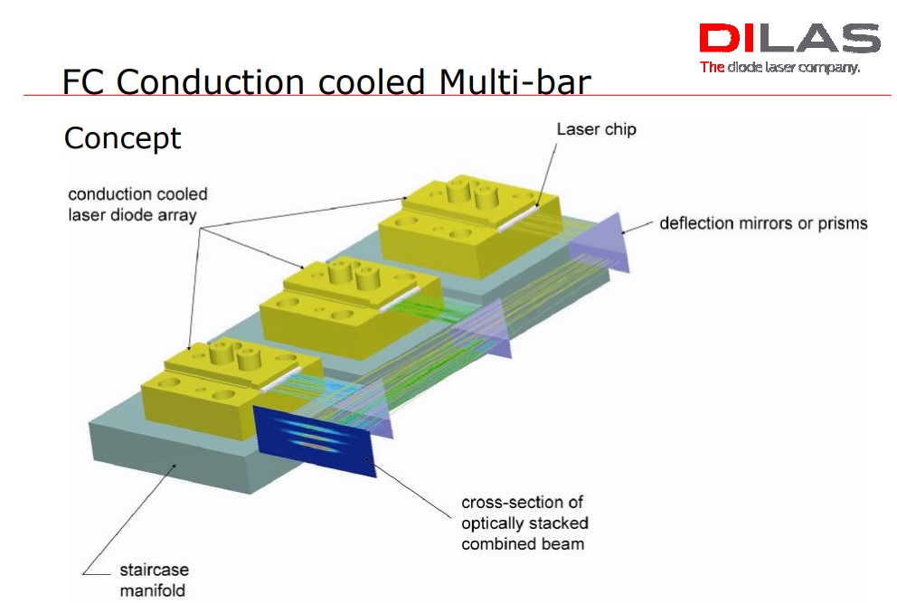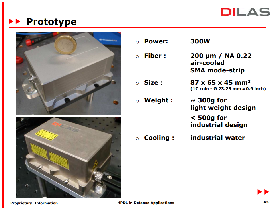 Actuellement les diodes lasers les plus puissantes font 300W pour 300 grammes donc avec un pack de 10 kg on obtient 10kW de sortie une vrai arme portable !