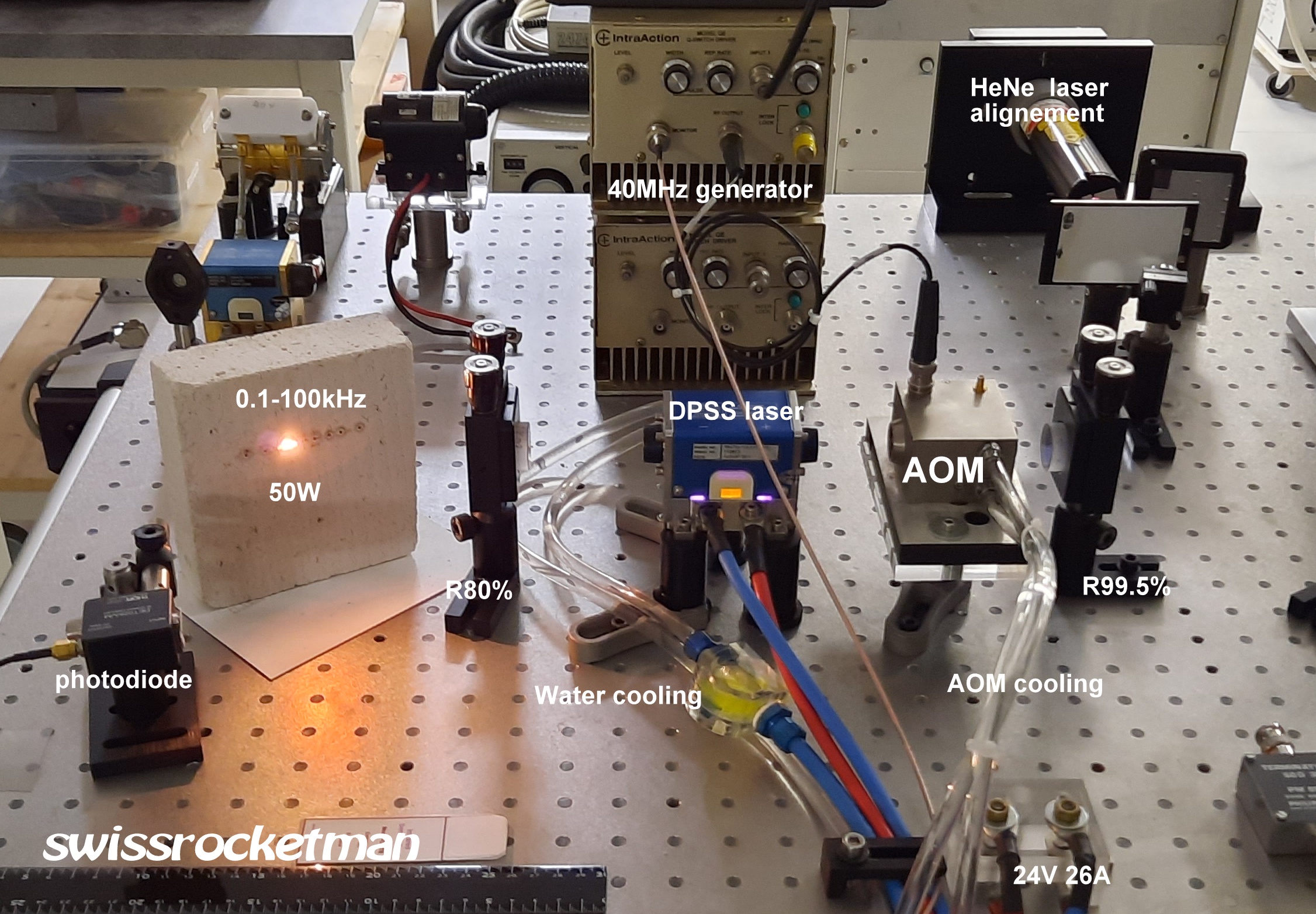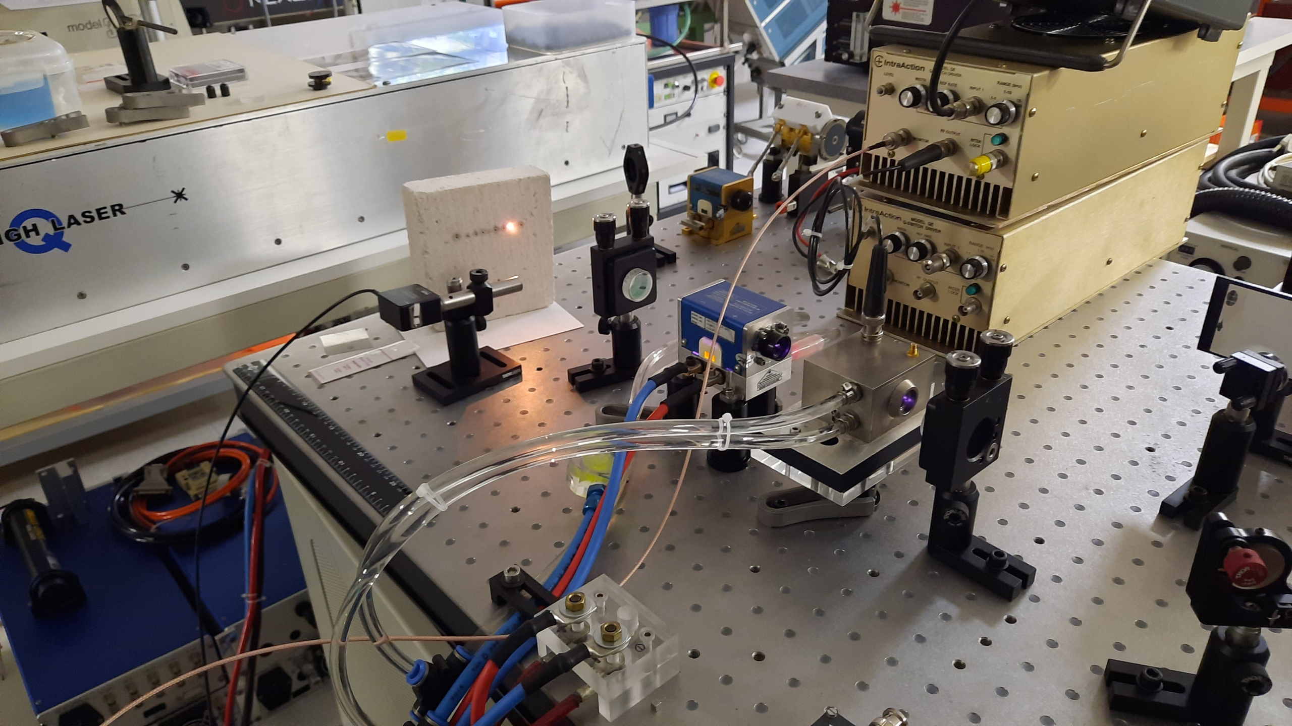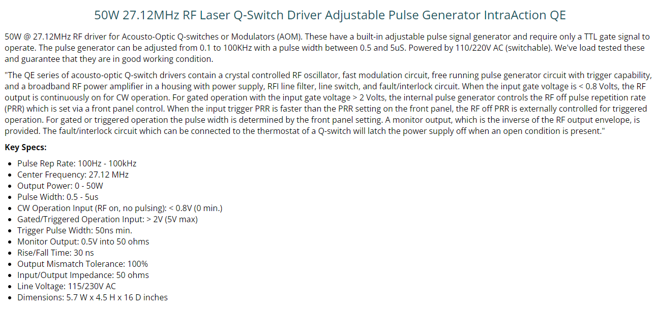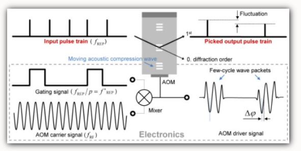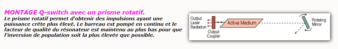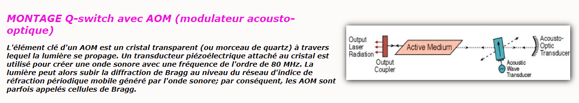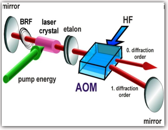 L’AOM, appelé Q switch, sert alors à bloquer le résonateur laser avant que l’impulsion ne soit générée. Dans la plupart des cas, le faisceau d’ordre zéro (non diffracté) est utilisé dans des conditions d’effet laser, et l’AOM est activé lorsque l’émission laser doit être interdite. Cela nécessite que les pertes de diffraction provoquées (éventuellement pour deux passages par aller-retour du résonateur) soient plus élevées que le gain du laser.