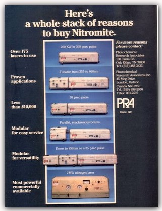 The PRA LN1000, the most powerfull commercial nitrogen laser,offer a 2MW output pulse of 600ps duration.