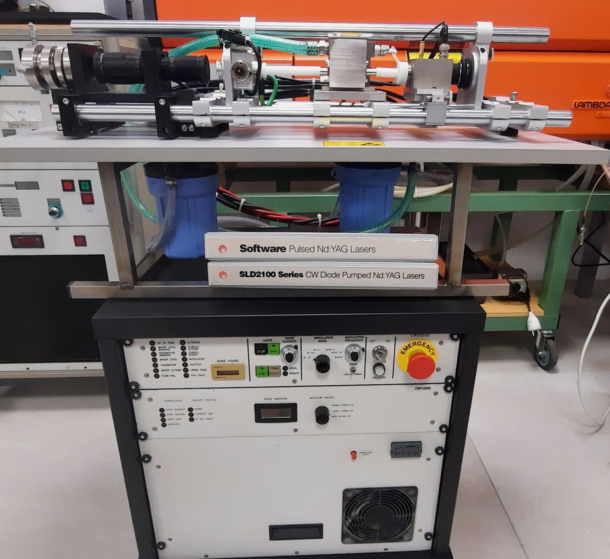 Pompage : diodes en continu (diode-pumped continuous) alimentant le barreau/tige (rod) Nd:YAG.