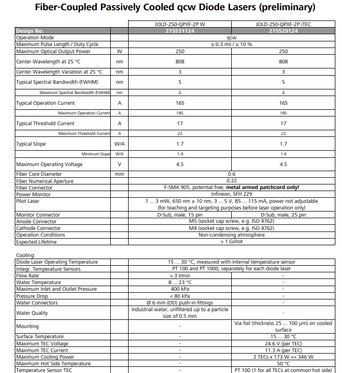 On trouve un modèle proche nommé JOLD-250-QPXF-2P iTEC, un module à fibre couplée de 250 W CW, refroidi par air et cellule de Peletier, diamètre de fibre 400 µm (NA 0,22).