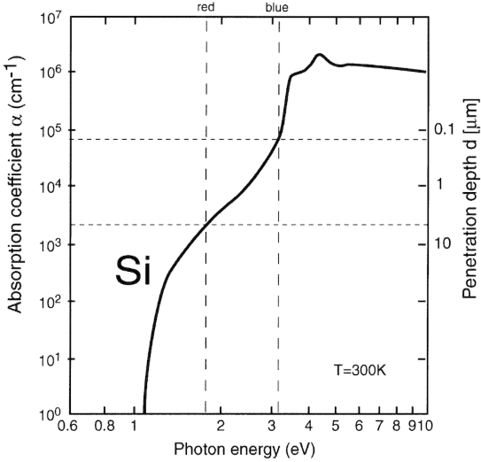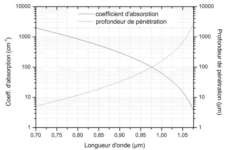 À température ambiante, le silicium a un coefficient d’absorption α très élevé à 915 nm (~1,35 eV, bien au-dessus de la bande interdite de 1,12 eV).