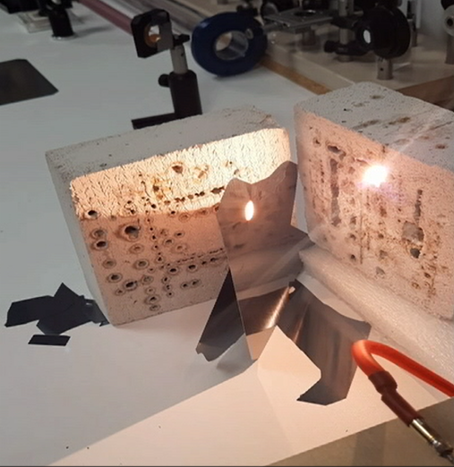 Impact du faisceau laser à 915 nm sur une plaque de silicium type P épaisseur 0.2 mm. On vois le point d’impact qui chauffe le silicium incliné de 45 degrés avec une absorption total sans réflection.