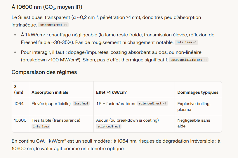 - L’échauffement sera beaucoup plus superficiel qu’à 915 nm : tu risques rapidement fusion, fissuration, noircissement ou ablation locale de la surface de Si (formation de cratère / plasma), plutôt qu’un simple changement progressif de réflectivité.