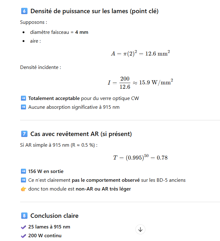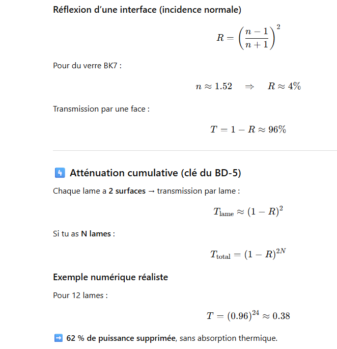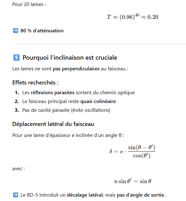 Le module Spectra-Physics BD-5 est un opérateur de faisceau optique passif, utilisé surtout avec des lasers continus (Ar⁺, Kr⁺, He-Cd, DPSS, etc.). À partir de tes photos (empilement de lames en verre à angle, trace violette, boîtier Spectra-Physics), on peut être très précis sur ce qu’il fait et comment ça marche physiquement et mathématiquement.