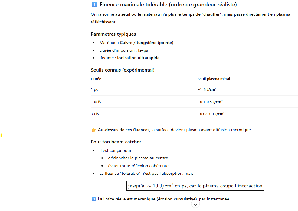 jusqu’aˋ ∼10 J/cm2 en ps, car le plasma coupe l’interaction\boxed{\text{jusqu’à } \sim 10\ \mathrm{J/cm^2}\ \text{en ps, car le plasma coupe l’interaction}}jusqu’aˋ ∼10 J/cm2 en ps, car le plasma coupe l’interaction