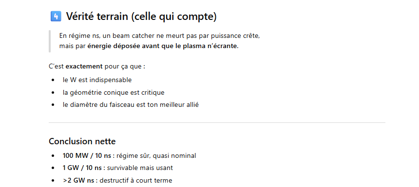 beam catcher (ou beam dump extrême), conçu non pas pour absorber gentiment… mais pour survivre à un tir catastrophique.