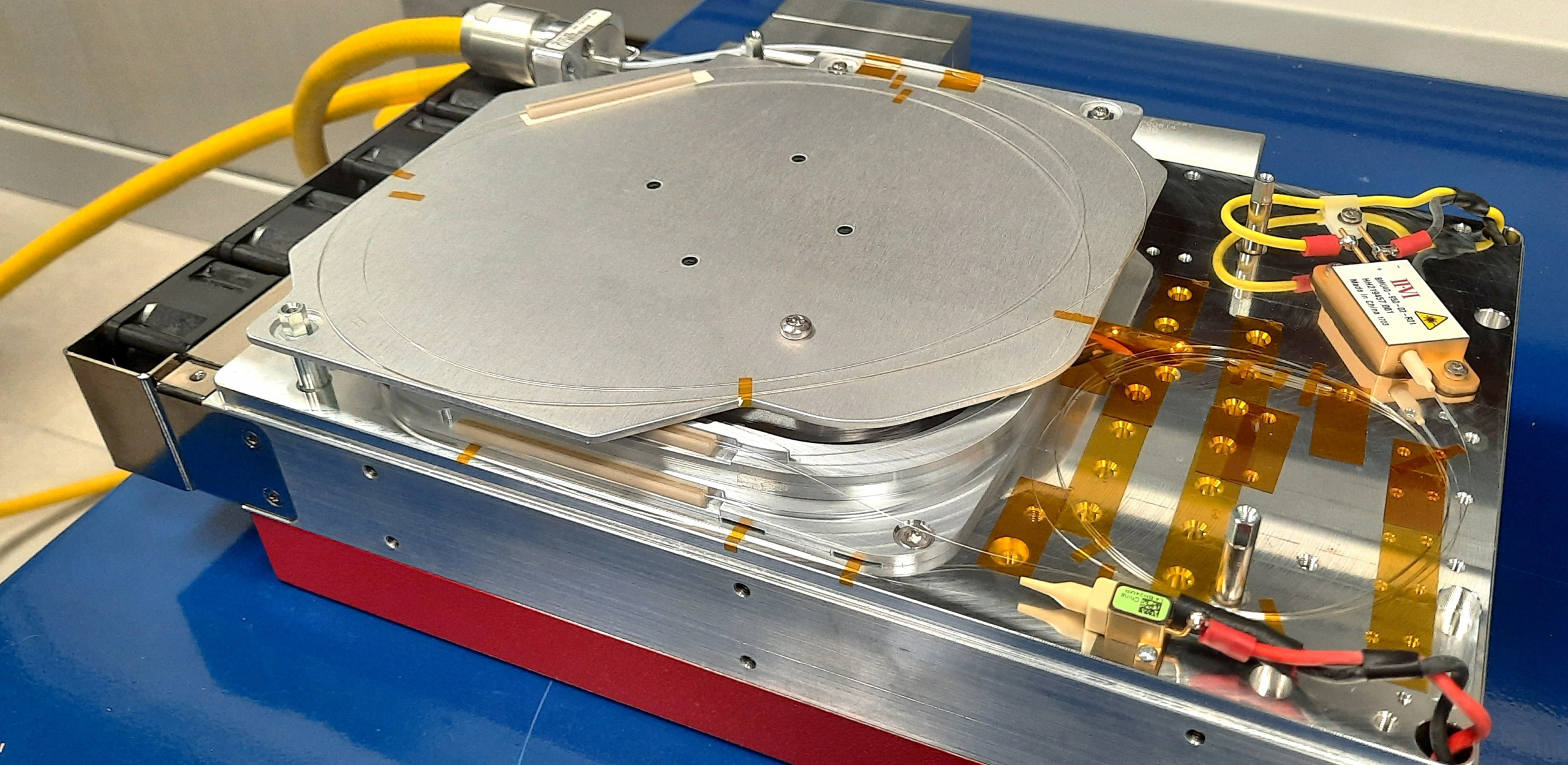 - Source de pompage : des diodes laser de puissance injectent leur lumière dans la gaine interne d’une fibre à double gaine, qui contient le dopage ytterbium.