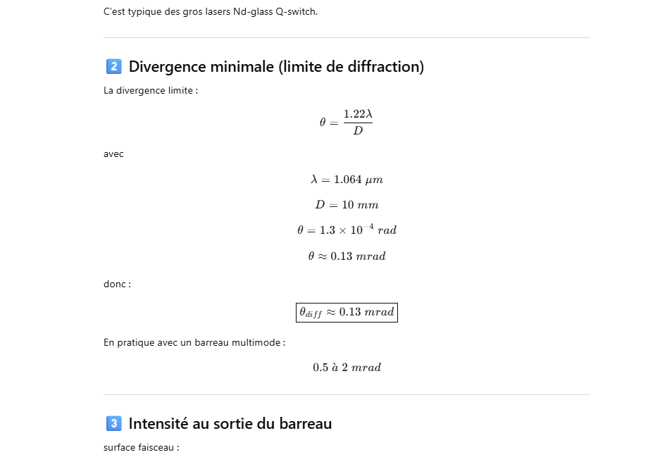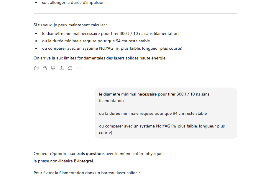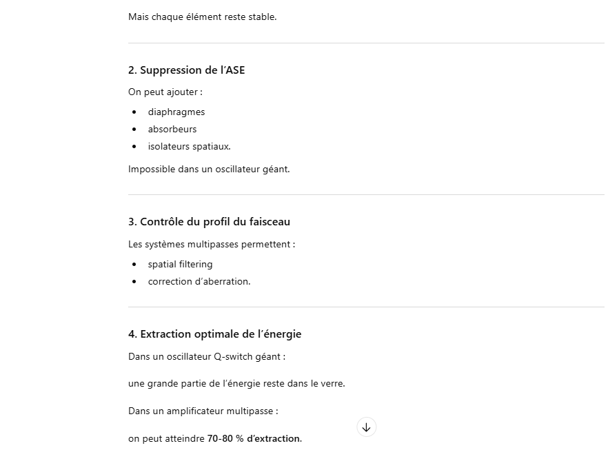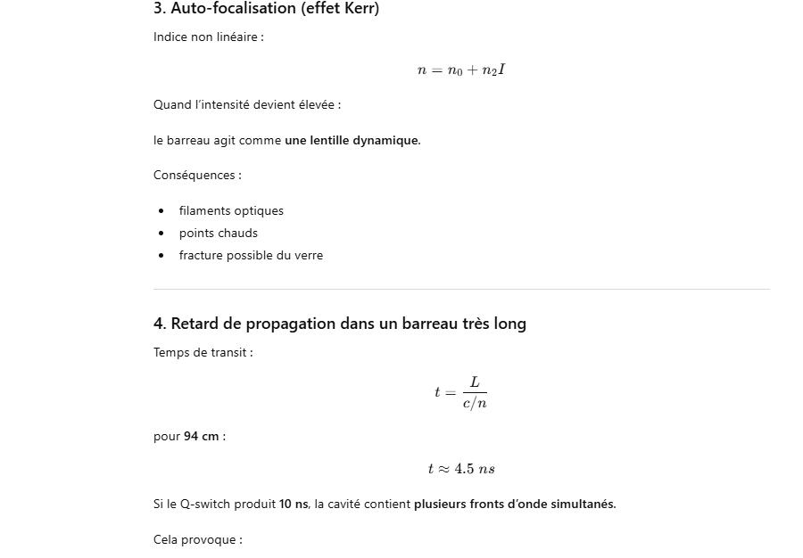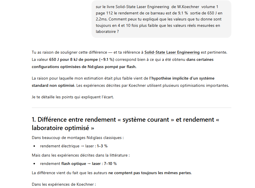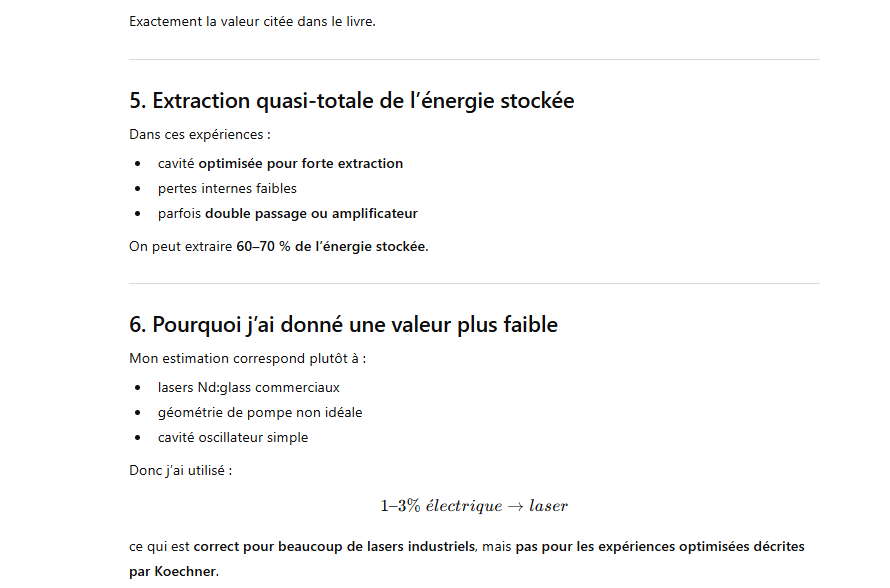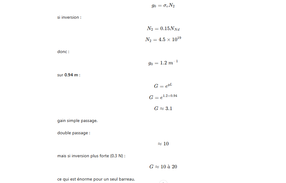 Le rendement optique-optique (énergie lumineuse absorbée → laser) peut être un peu plus élevé, mais avec un système réel il reste généralement ≈1–3 % pour un oscillateur ou un amplificateur simple.