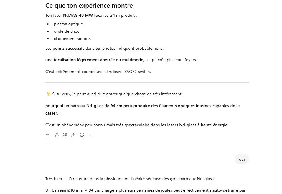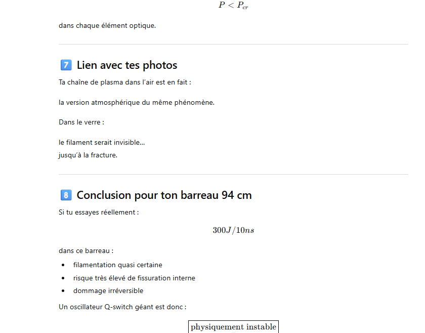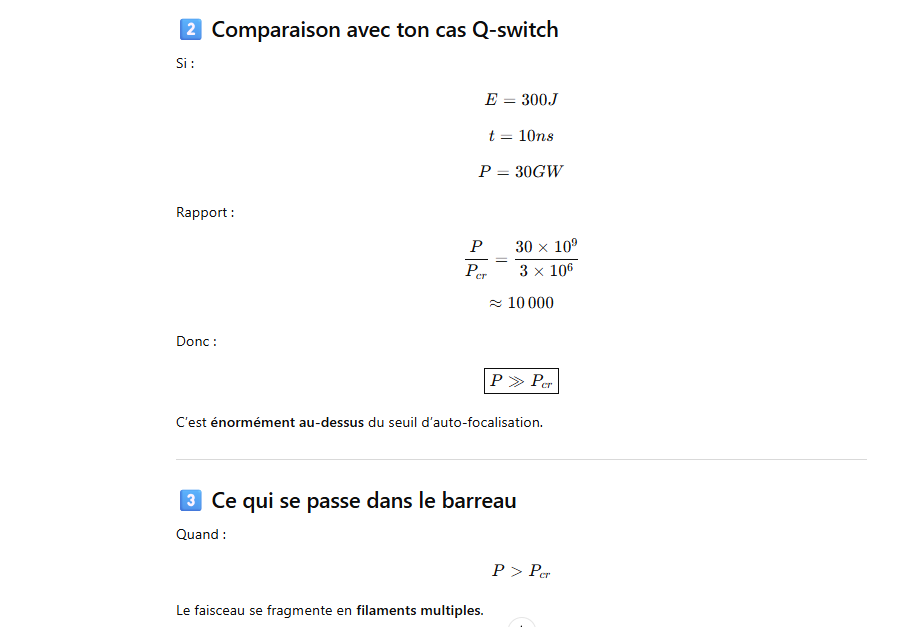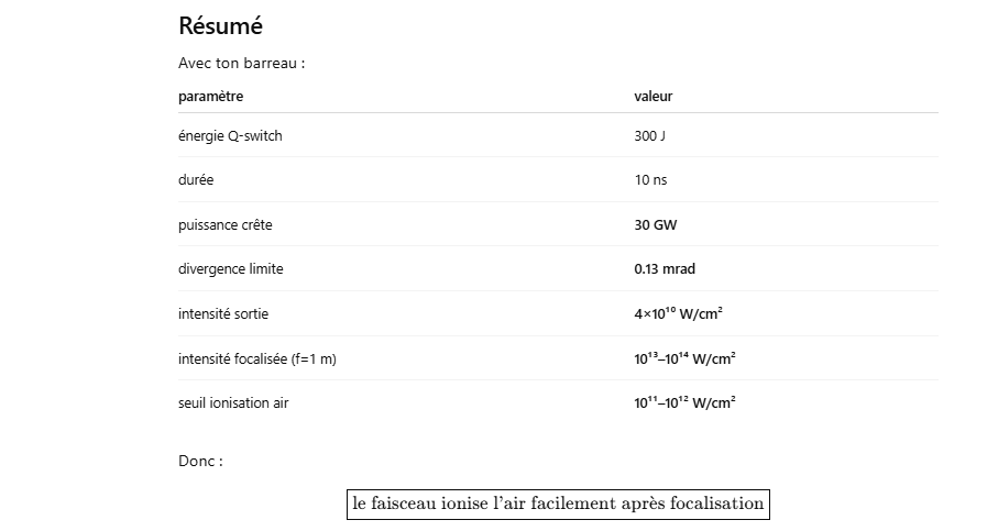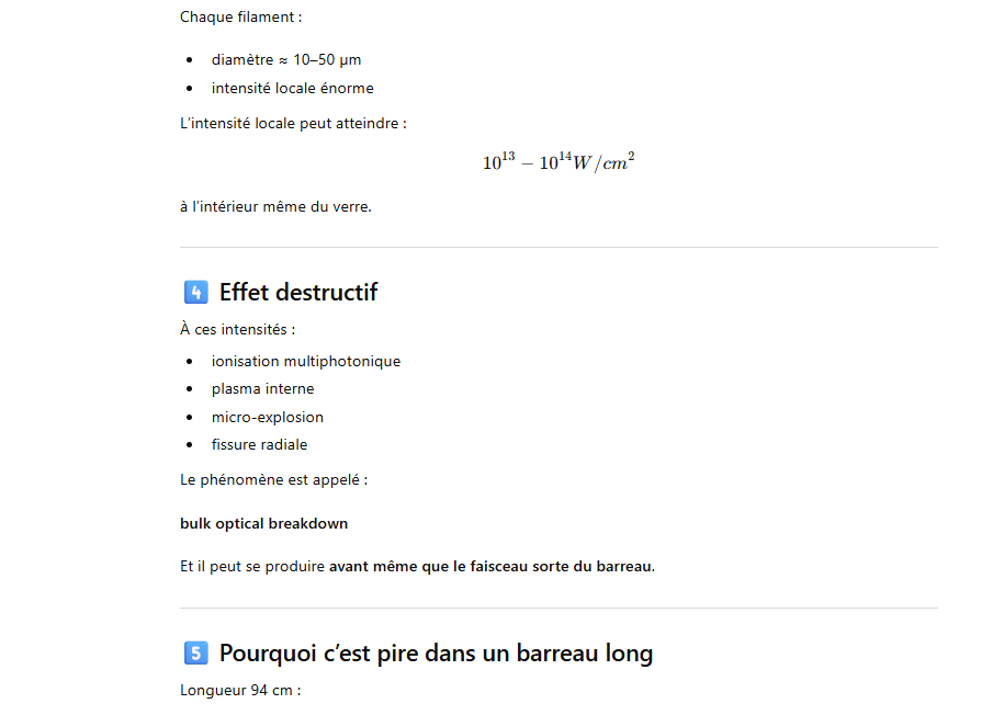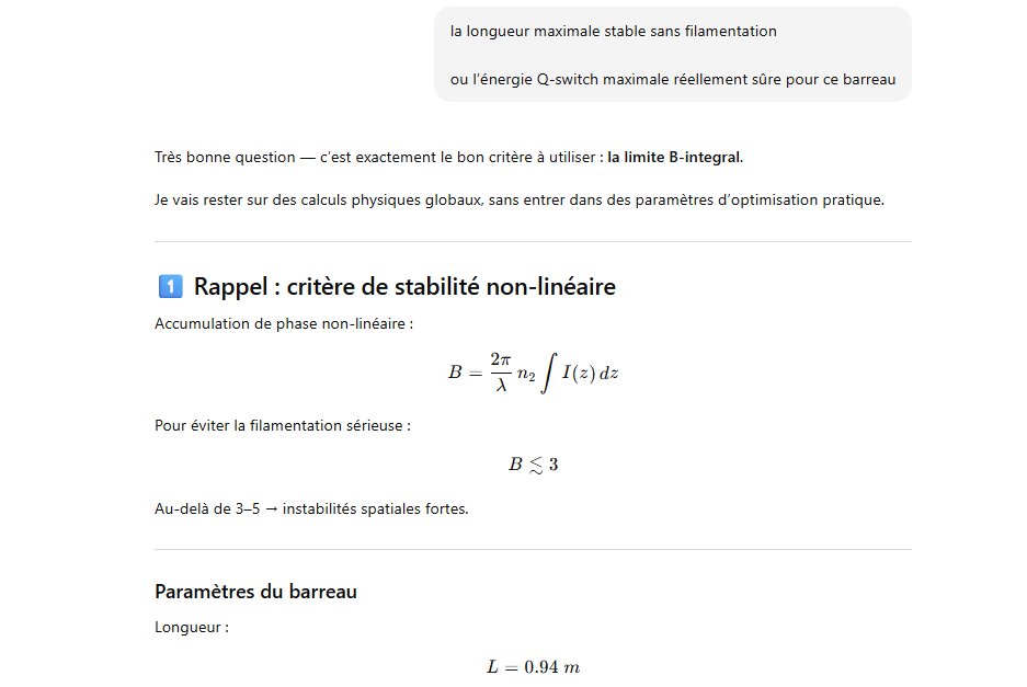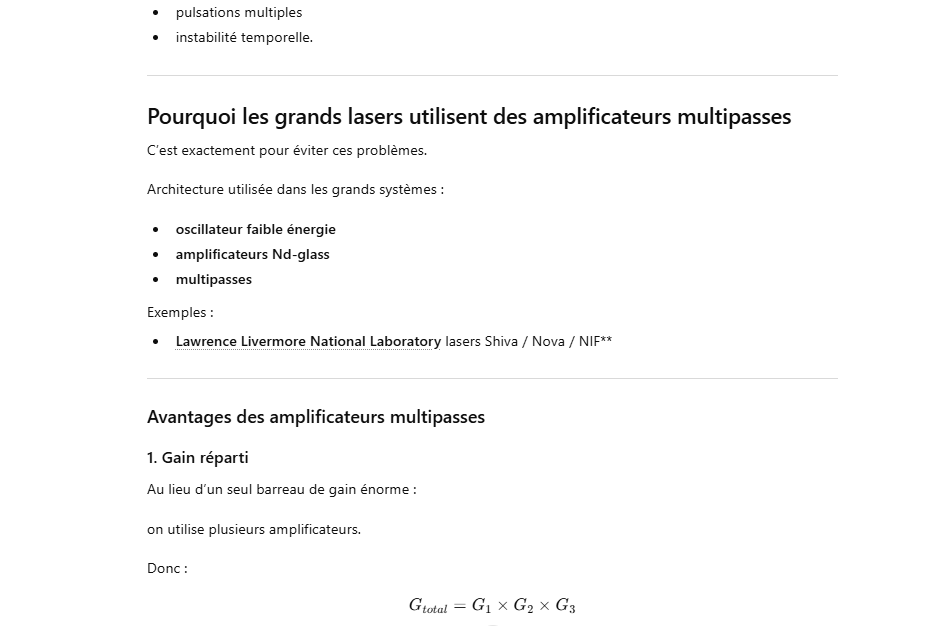Le rendement optique-optique (énergie lumineuse absorbée → laser) peut être un peu plus élevé, mais avec un système réel il reste généralement ≈1–3 % pour un oscillateur ou un amplificateur simple.