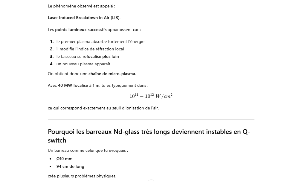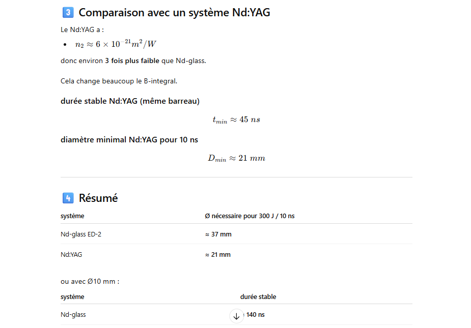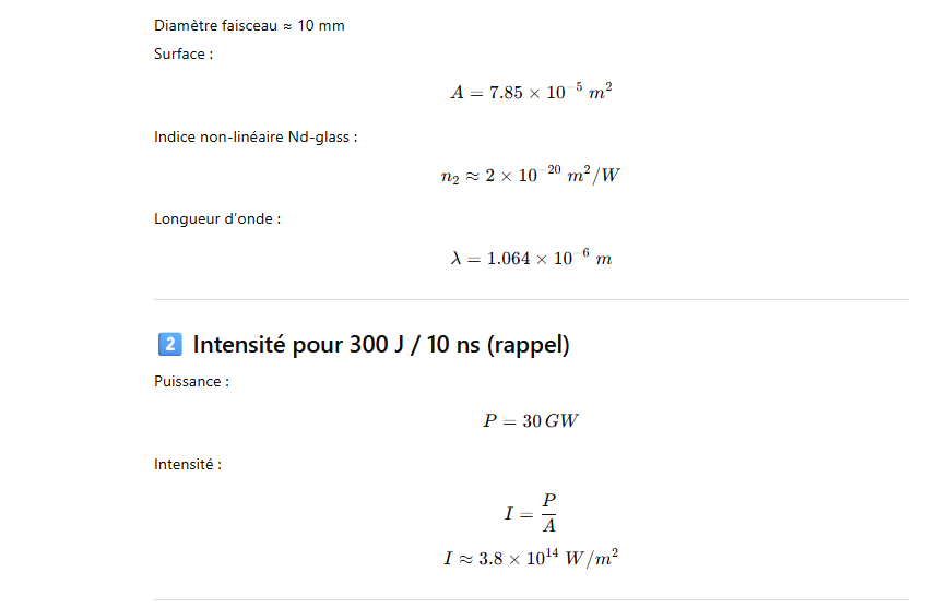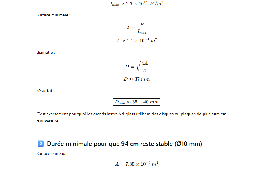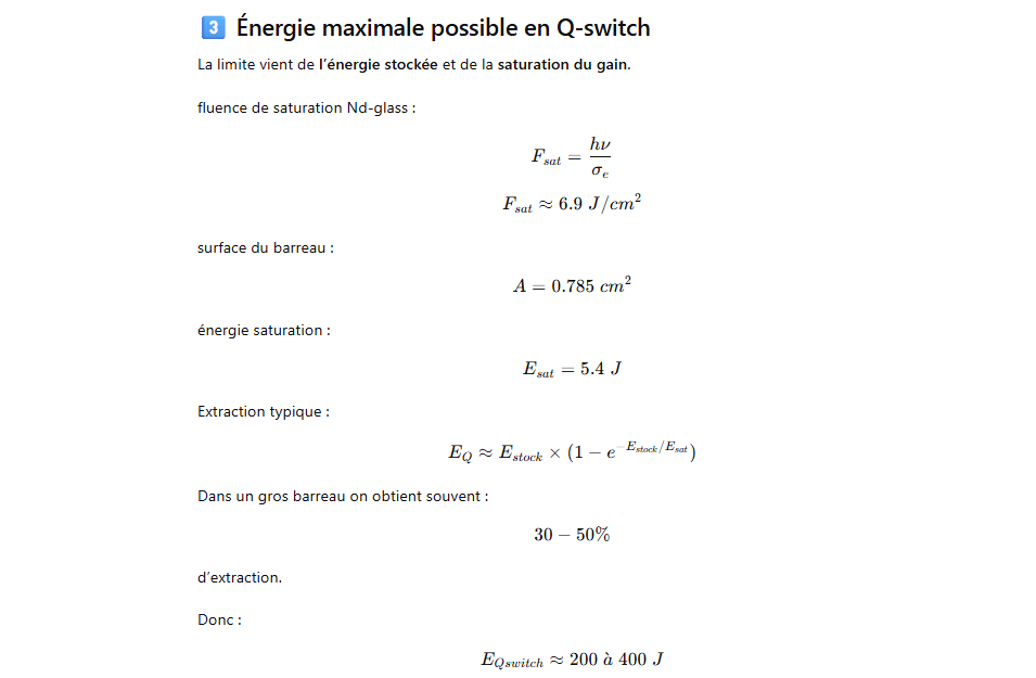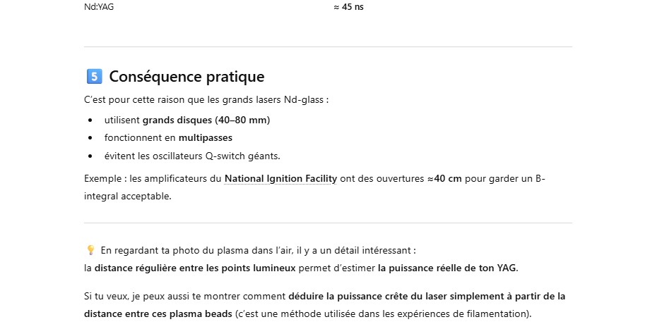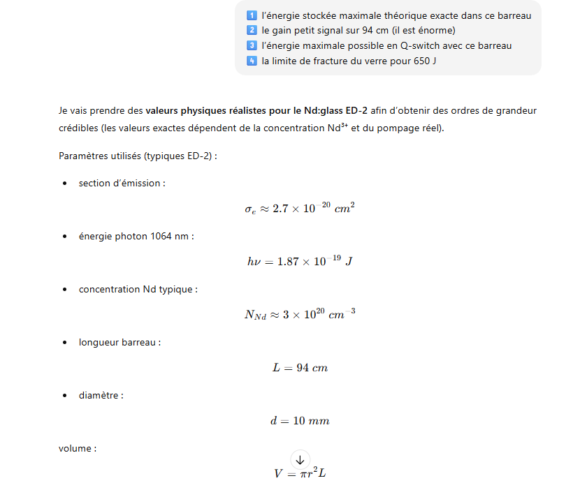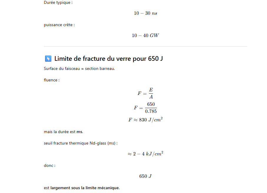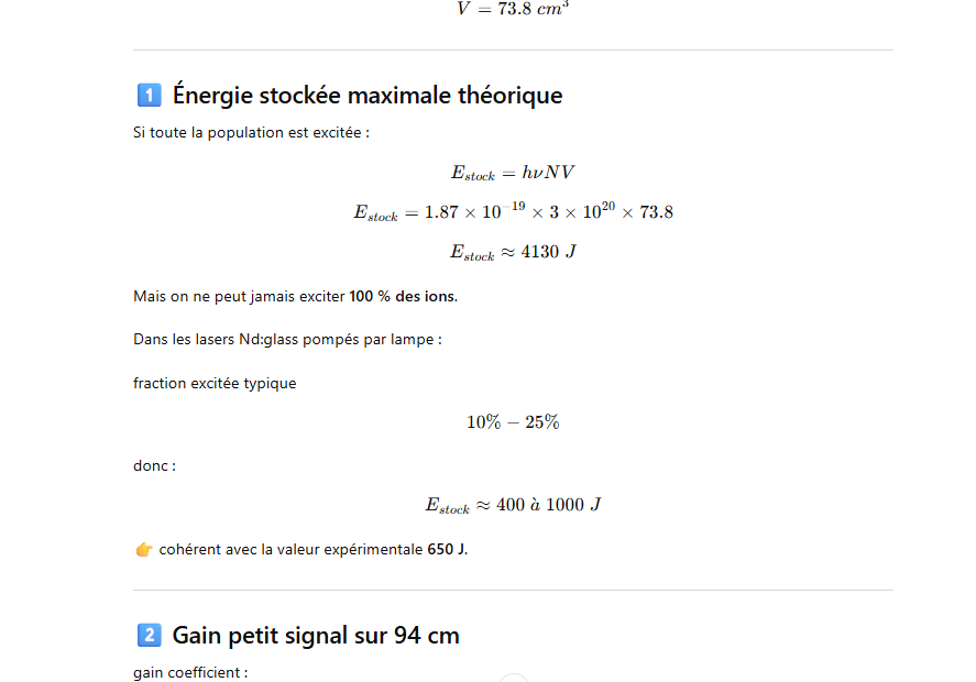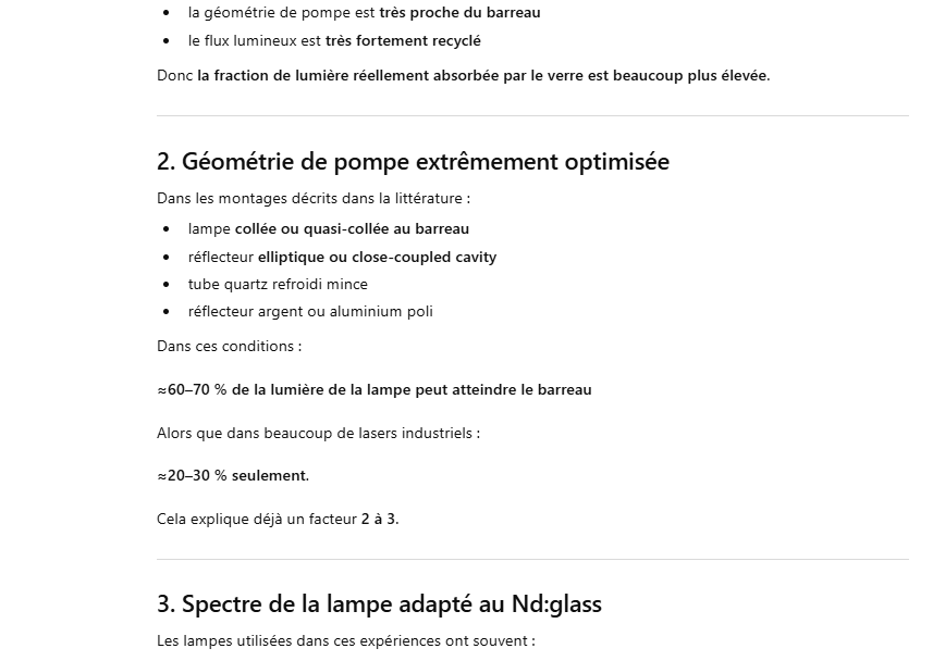 Les grands lasers Nd-glass pompés par flash ont un rendement global très faible, typiquement ≈1–1.5 % de l’énergie électrique injectée dans la lampe convertie en énergie laser.