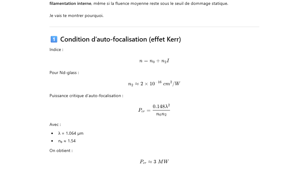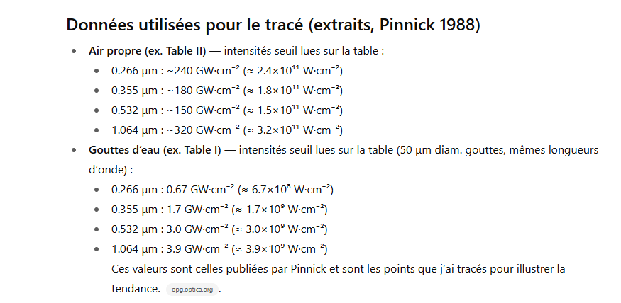 Seuil de dommage (LIDT) — très dépendant : qualité du polissage, propreté, revêtement AR, durée d’impulsion, diamètre du faisceau, présence d’inclusions (Pt) etc.