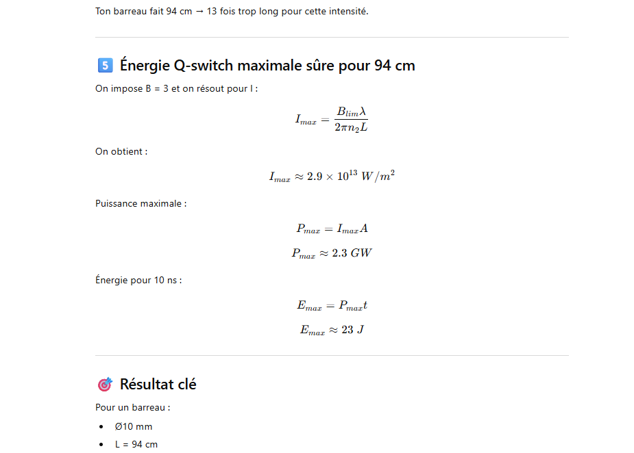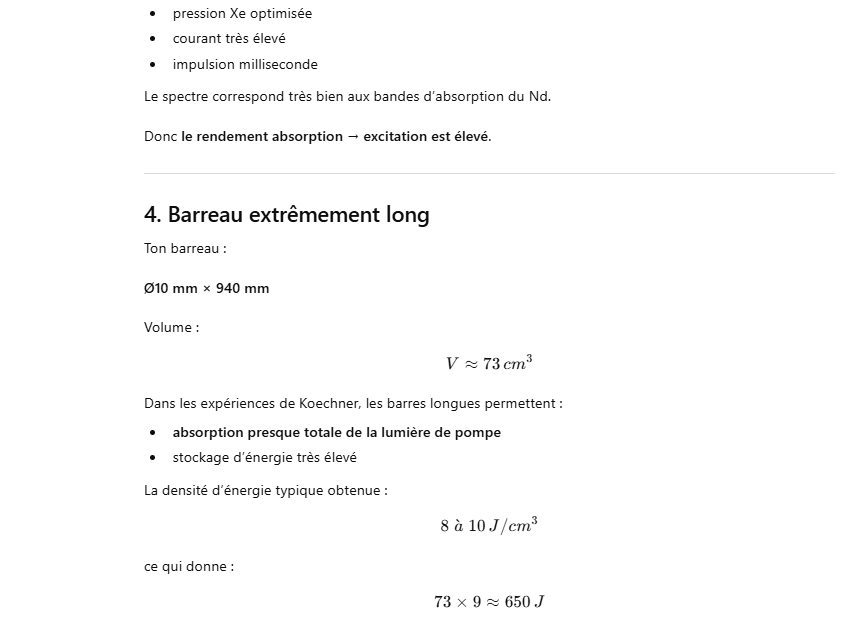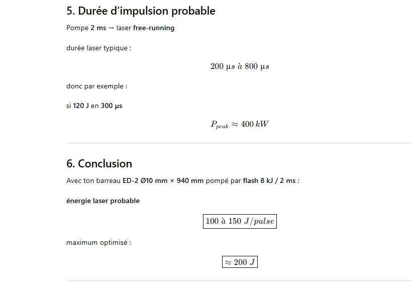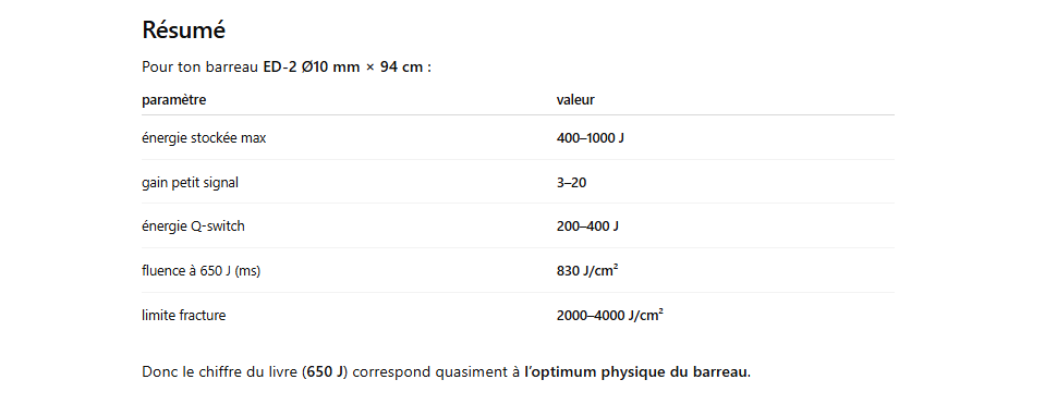peux tu me dire l’énergie par pulse que je peux obtenir avec un barreau laser ED-2 de diamètre 10mm et de 940 mm de long pompé par un tube flash linéaire de 8000 joules en 2 ms avec un couplage procche
