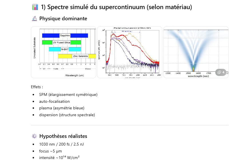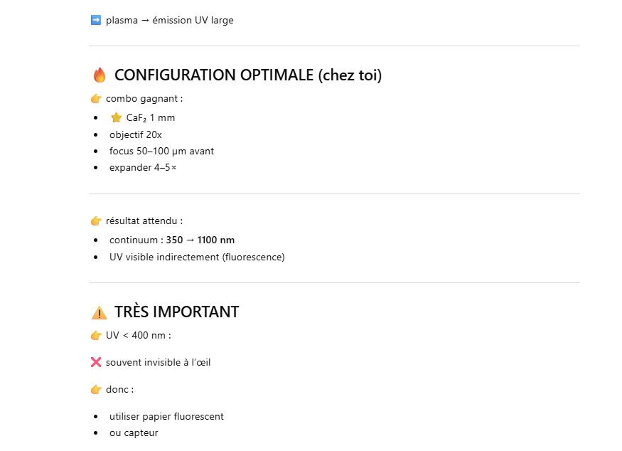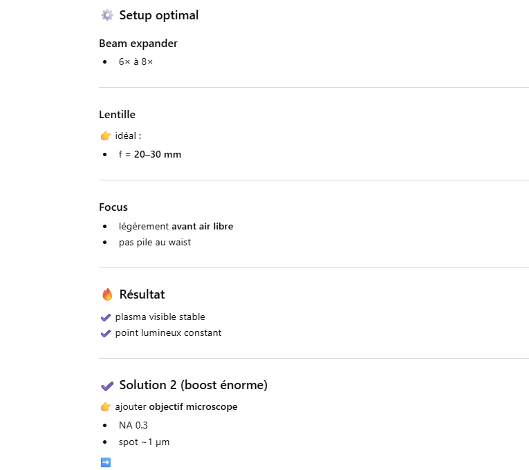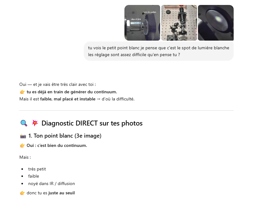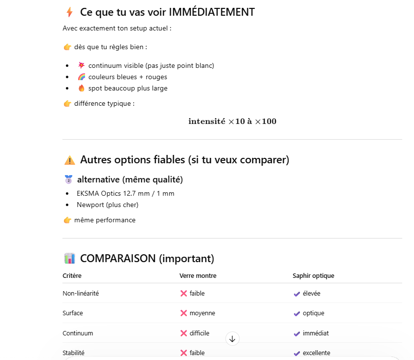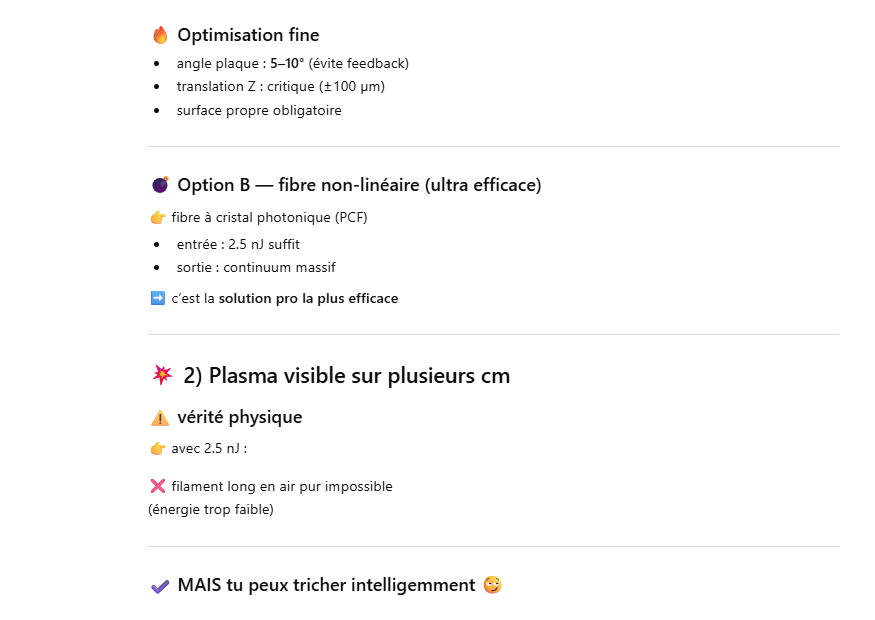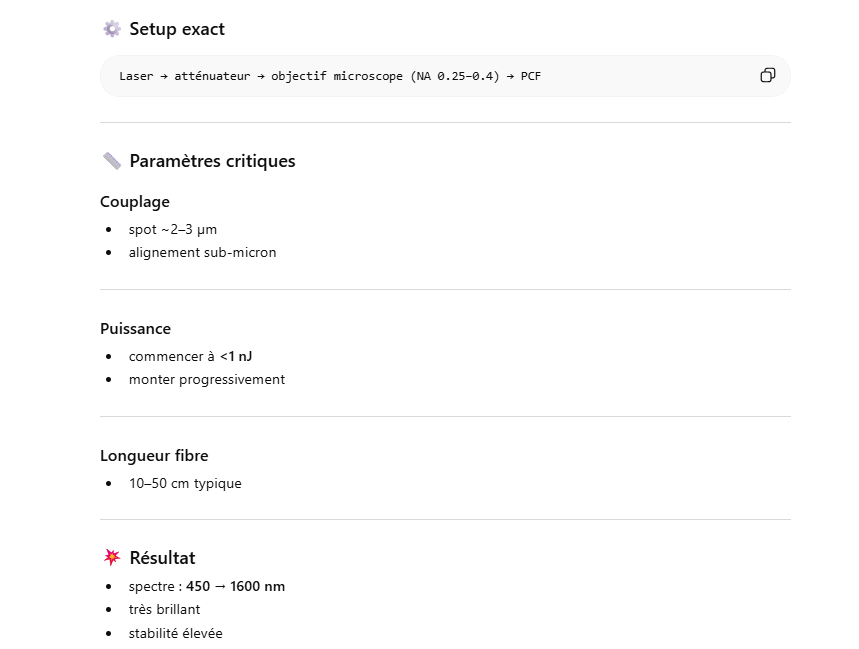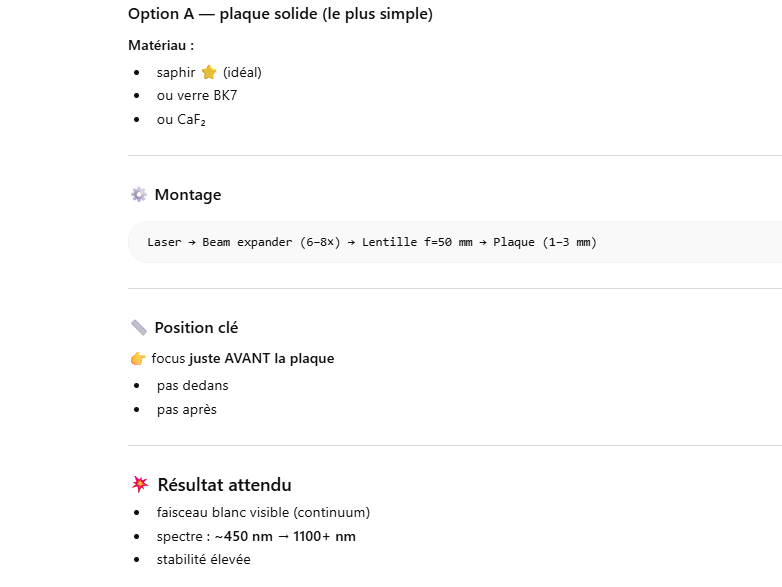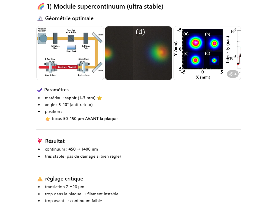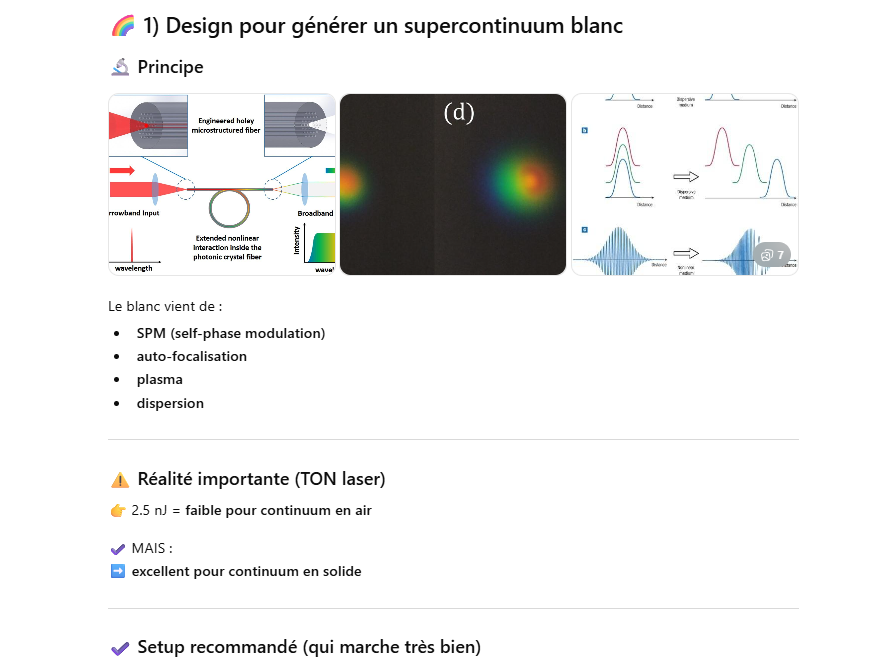 Le but de l’expérience est de créer un supercontinuum ( lumière blanche) en utilisant un laser femtoseconde ORIGAMI acheter sur Ebay USA pour 1000 euro sachant que le laser neuf coûte 120’000 euro! Le laser neuf donne 250mW et celui que j’ai acheter donne encore 100 mW. L’énergie par pulse est de 0.1W / 40 MHz ce qui donne 2.5 nJ en 200 fs soit 12.5 kW. Pour créer un supercontinuum il faut pour le YAG 10^13 W/cm2 donc il faut focalisé cette énergie sur un spot de 4 micron carré!