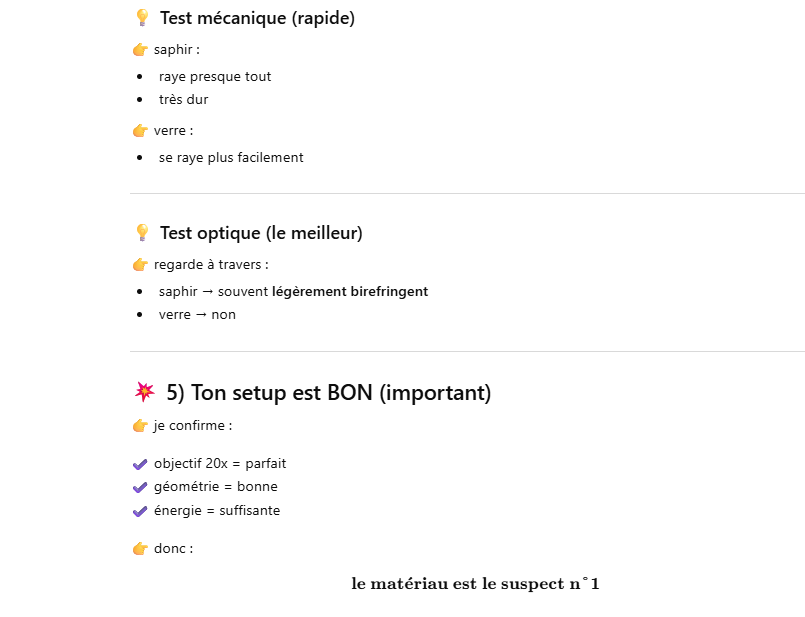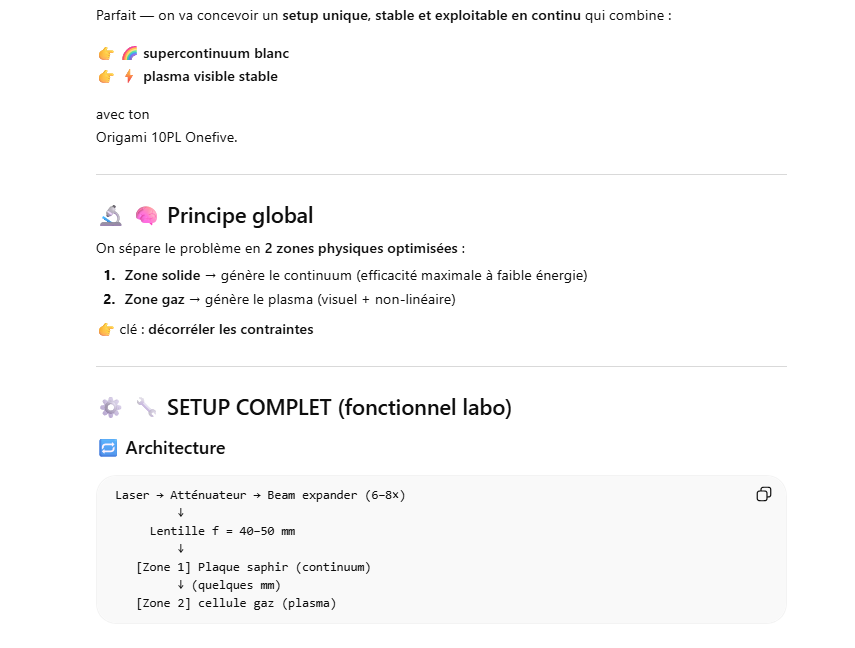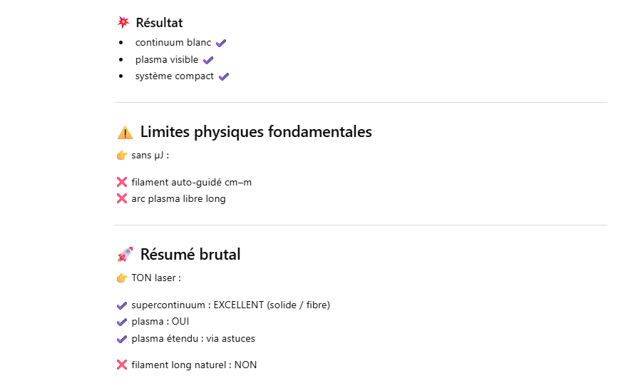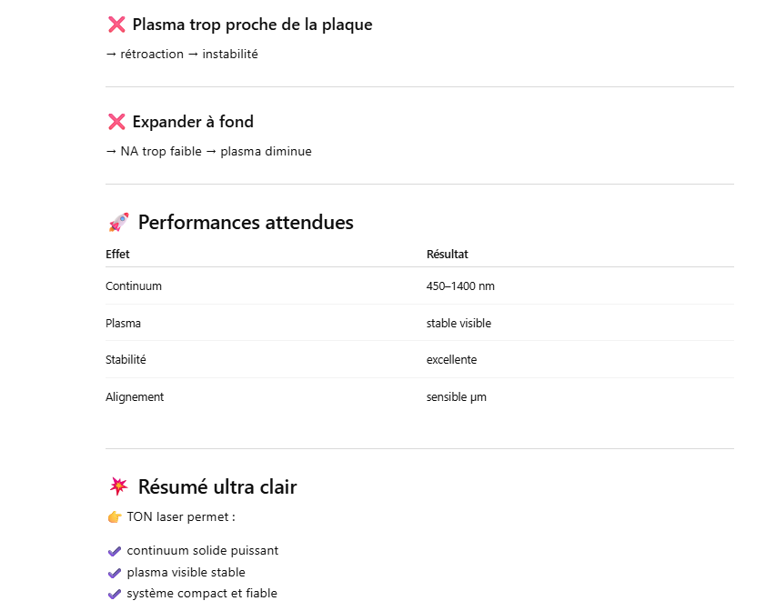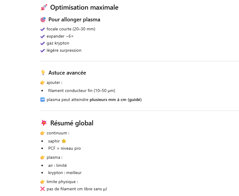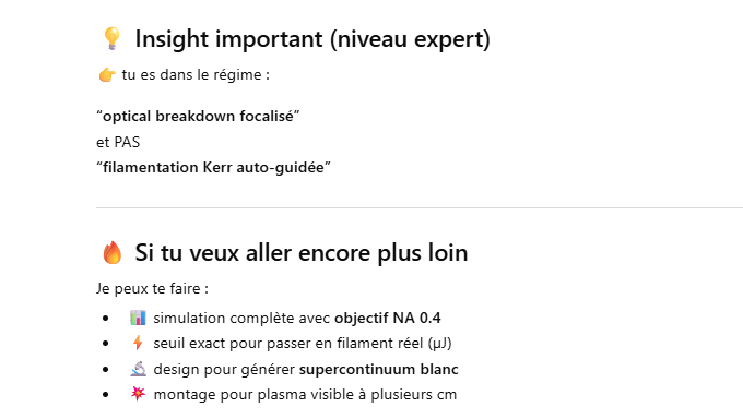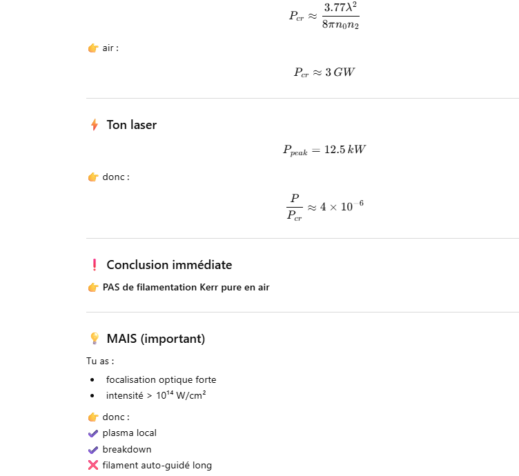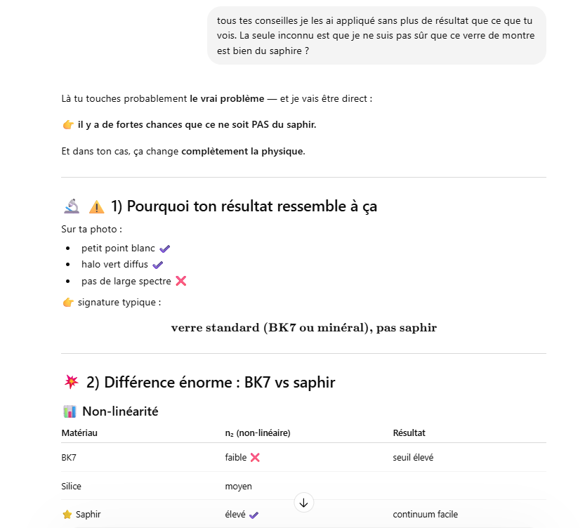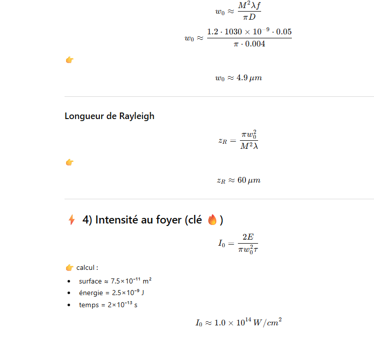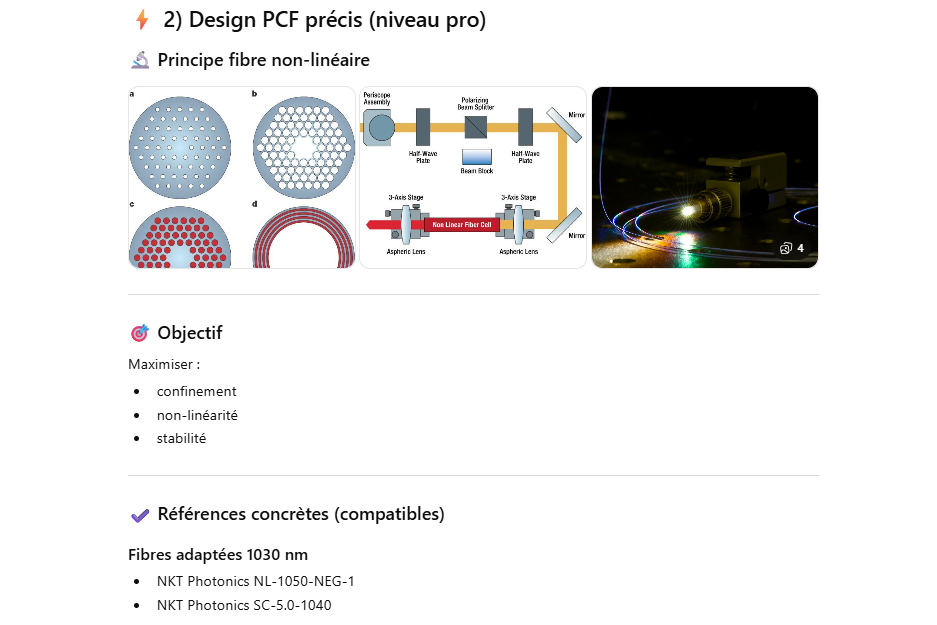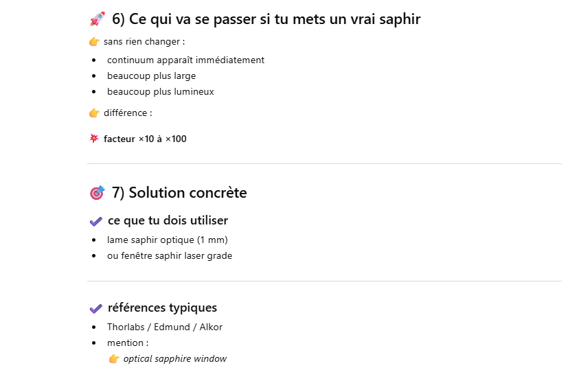 Le but de l’expérience est de créer un supercontinuum ( lumière blanche) en utilisant un laser femtoseconde ORIGAMI acheter sur Ebay USA pour 1000 euro sachant que le laser neuf coûte 120’000 euro! Le laser neuf donne 250mW et celui que j’ai acheter donne encore 100 mW. L’énergie par pulse est de 0.1W / 40 MHz ce qui donne 2.5 nJ en 200 fs soit 12.5 kW. Pour créer un supercontinuum il faut pour le YAG 10^13 W/cm2 donc il faut focalisé cette énergie sur un spot de 4 micron carré!