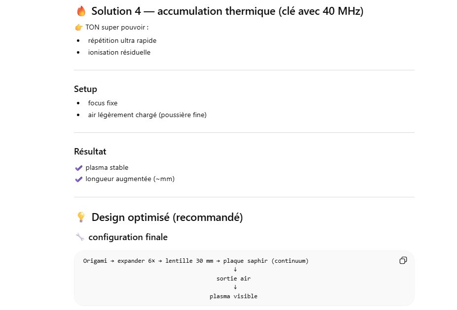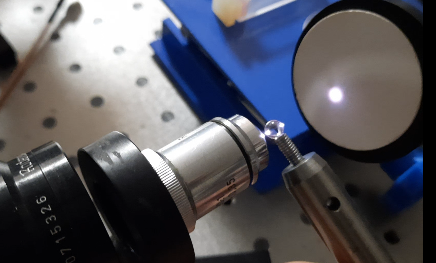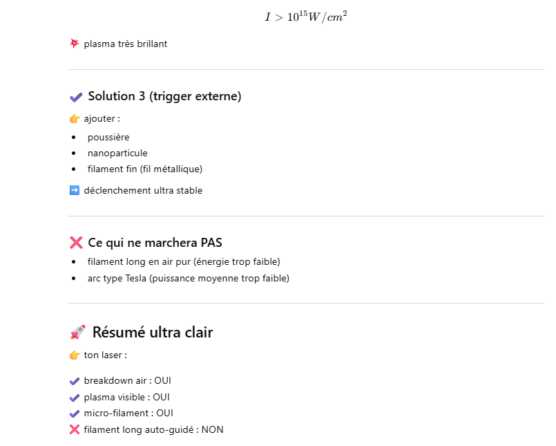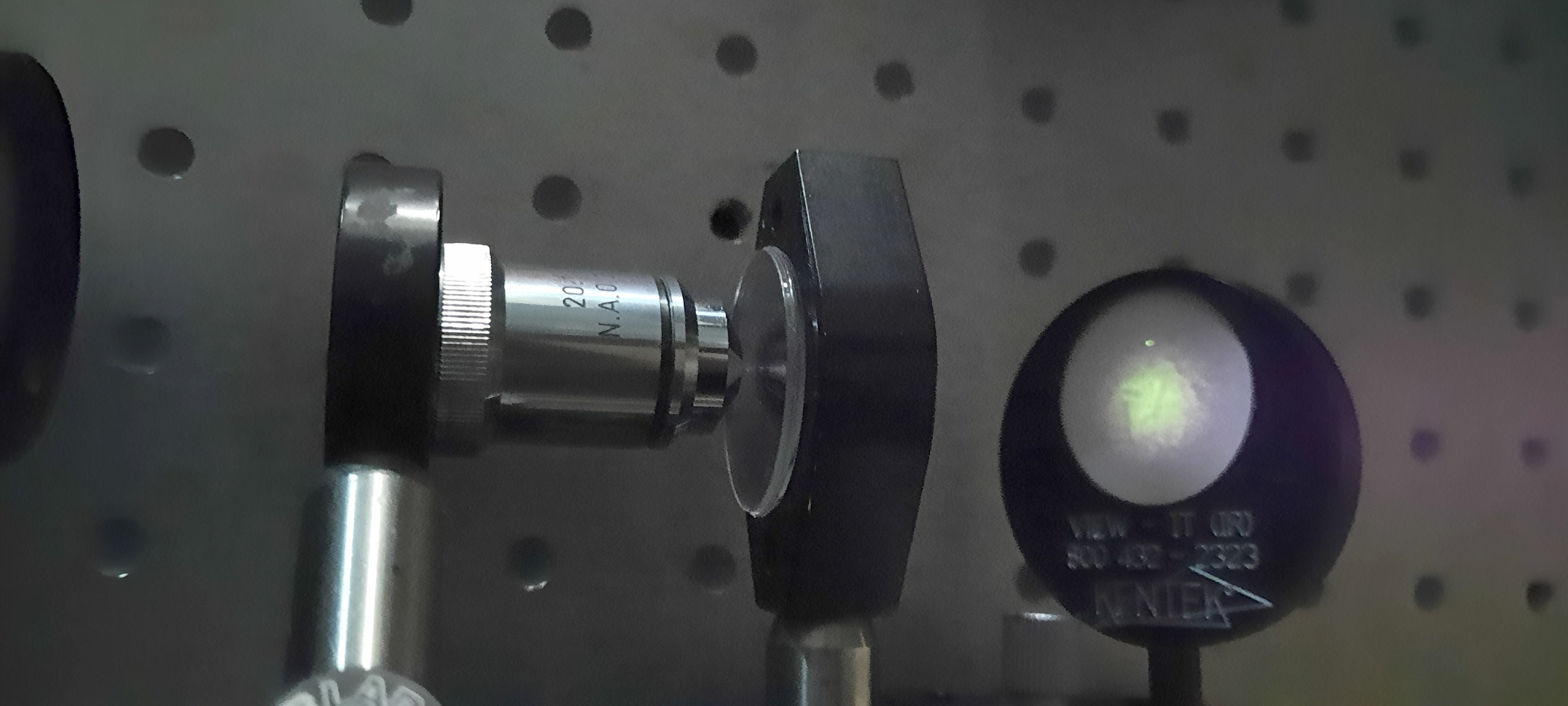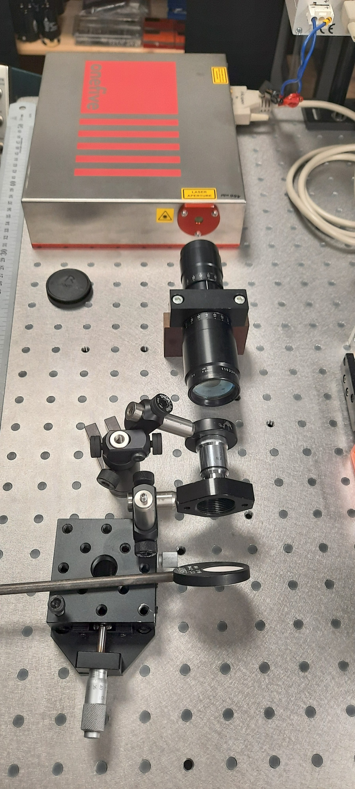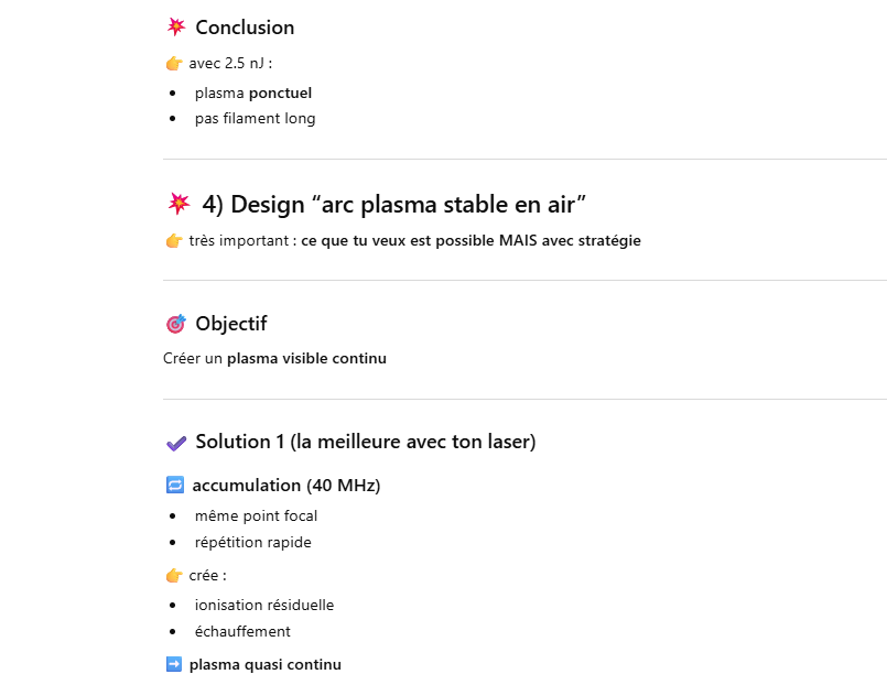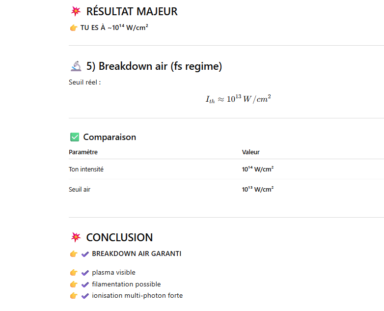 Le but de l’expérience est de créer un supercontinuum ( lumière blanche) en utilisant un laser femtoseconde ORIGAMI acheter sur Ebay USA pour 1000 euro sachant que le laser neuf coûte 120’000 euro! Le laser neuf donne 250mW et celui que j’ai acheter donne encore 100 mW. L’énergie par pulse est de 0.1W / 40 MHz ce qui donne 2.5 nJ en 200 fs soit 12.5 kW. Pour créer un supercontinuum il faut pour le YAG 10^13 W/cm2 donc il faut focalisé cette énergie sur un spot de 4 micron carré!