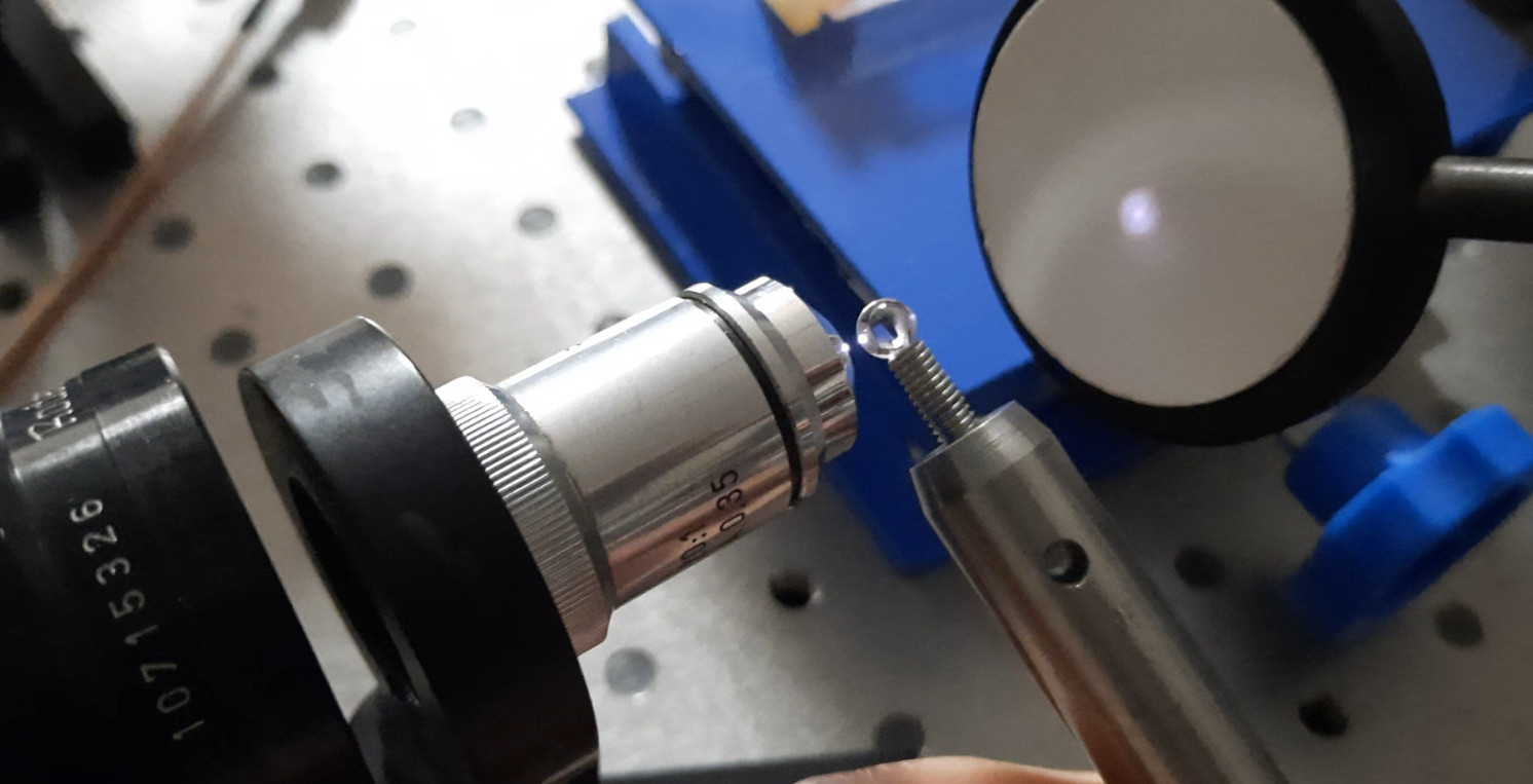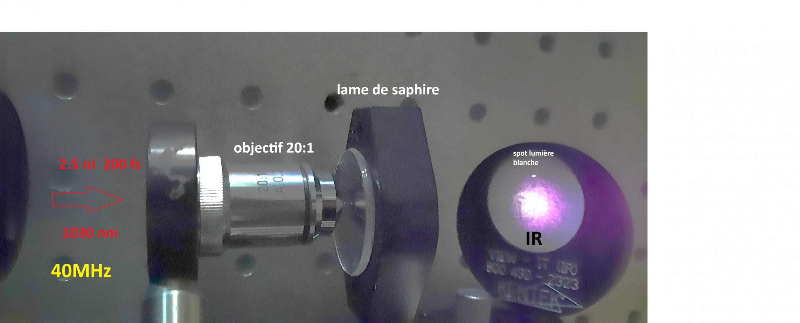Montage de l’expérience ; Laser femtoseconde 40 MHz 2.5 nJ M= 1.1 on traverse un télescope 4 : 1 puis un objectif de microscope 20 : 1 focalise sur la bille en YAG:Nd pour généré le supercontinuum