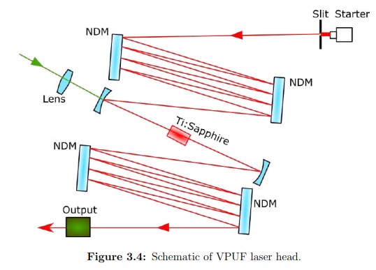 La tête VPUF utilise des mirroirs à dispersion négative (NDM) pour compenser la dispersion et obtenir des impulsions <100 fs.