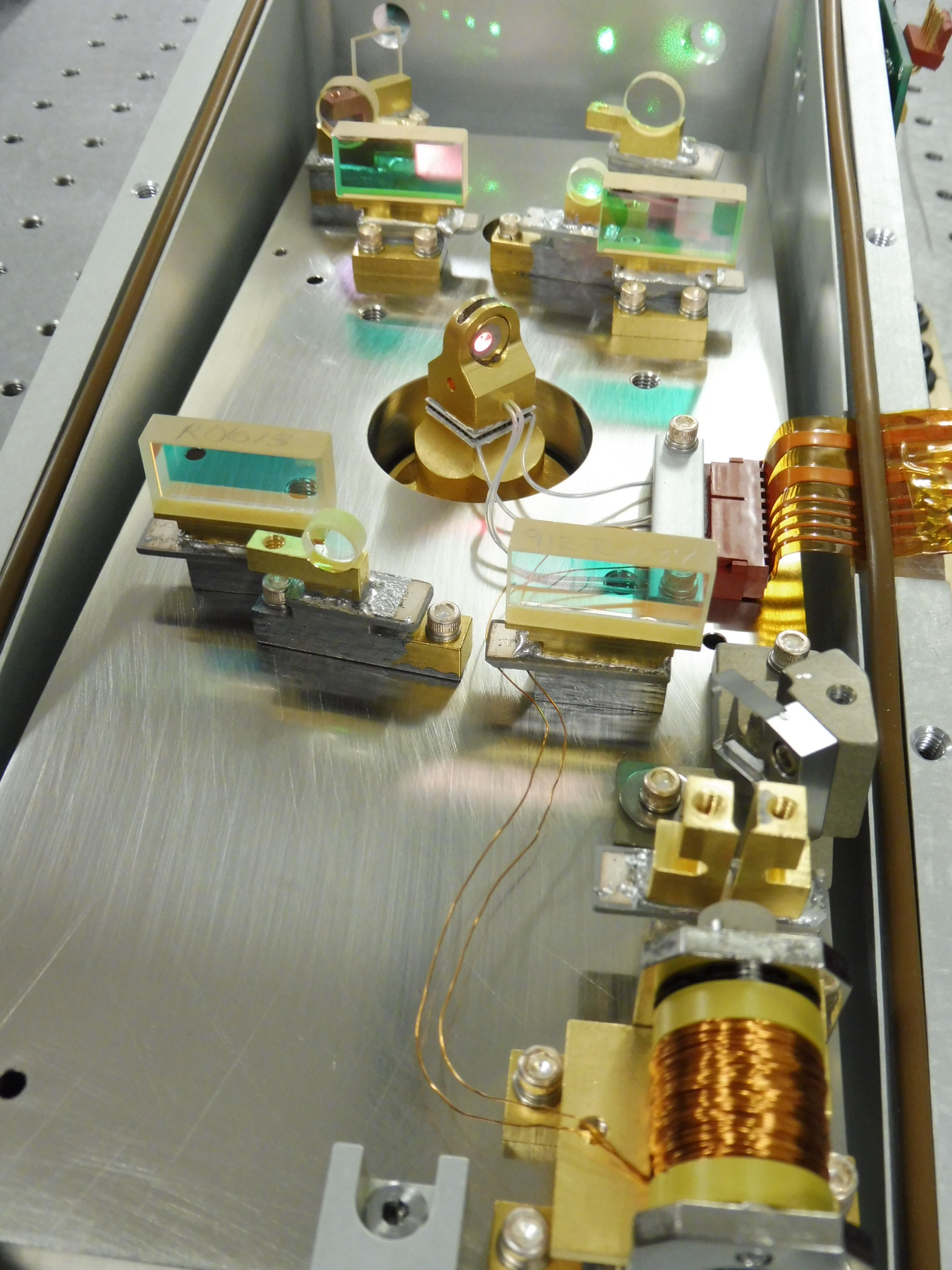 Ce laser femto se compose d’un barreau titane saphir de 7mmde diamètre et 8mm de long avec les extrémités taillées à l’incidence de Brewster. Le pompage ce fait au moyen d’un laser DPSS doublé en fréquence 532nm qui est focalisé dans le barreau Ti:Sa . Le résonnateur se compose de 2 miroirs concaves totalement réflecteur, d’un miroir de sortie fixe ayant un coeficient de transmission de 4% et d’un miroir totalement réflecteur R=99.95%. Ce miroir est monté sur un actuateur électromagnétique permettant de passer du régine continu au régime impulsionelle en fesant bouger le miroir par une impulsion de courant dans la bobine (starter). La synchronisation des modes longitudinaux ( environ 5000) est réalisé dans le cristal Ti:Sa par effet KERR. Le cristal est maintenu à 22°C au moyen d’une cellule de PELTIER (TEC).