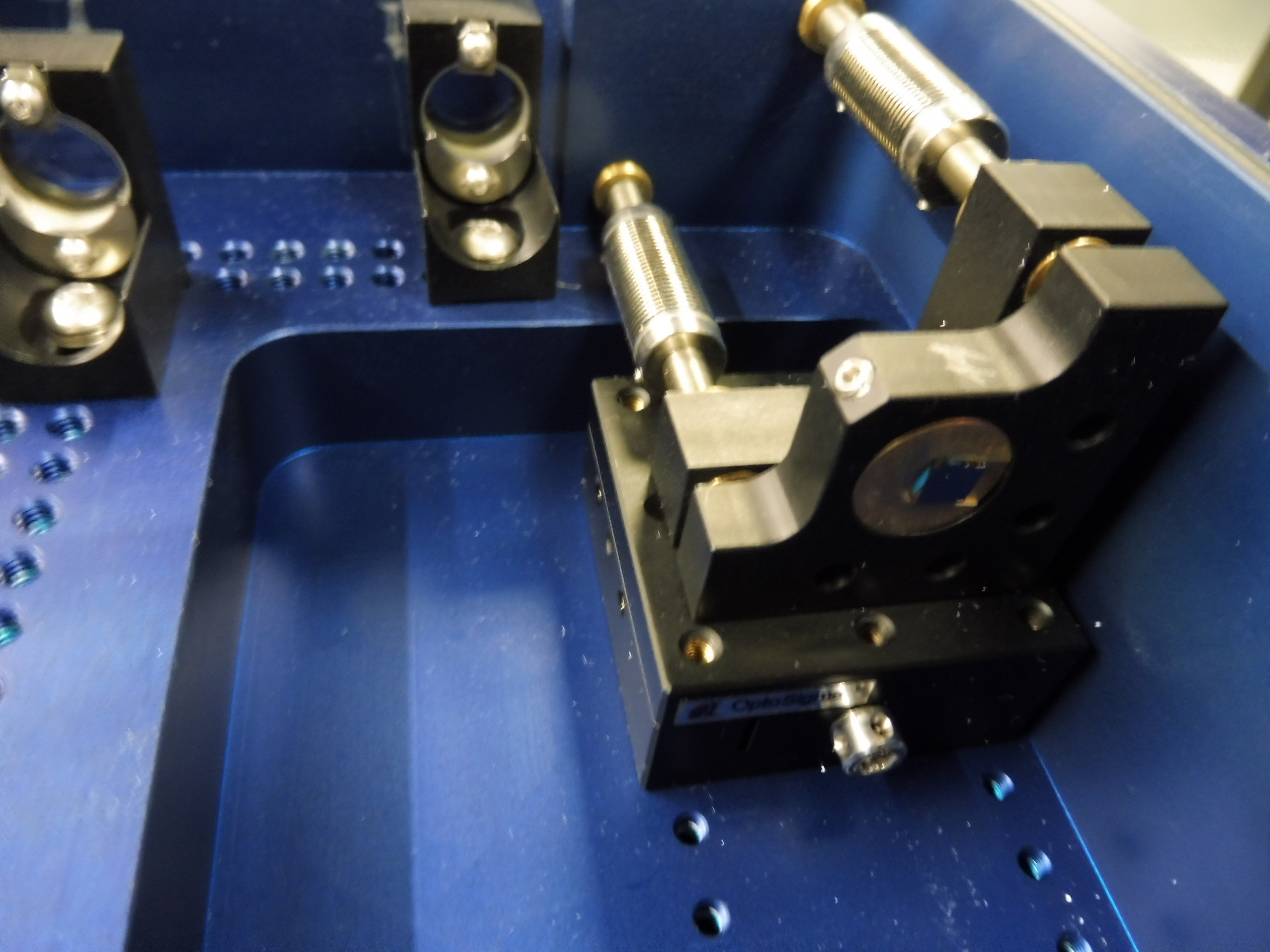 La cavité comprend un mirroir SESAM dont le coefficient de réflection dépend de l’intensité lumineuse ce qui permet de synchronisé les modes longitudinaux dans la cavité pour obtenir des impulsions picosecondes. D’un miroir de sortie semi transparent convex d’une lame dichroïque laissant passer le faisceau pompe à 808nm (30W) et réfléchissant le faisceau laser à 1064 nm. Une lentille de focalisation de 50mm de focal permettant de pompé le cristal amplificateur. Plusieurs miroirs plan et concave ayant des couches multidiélectriques ayant un GVD négatif -600 et -400 fs2